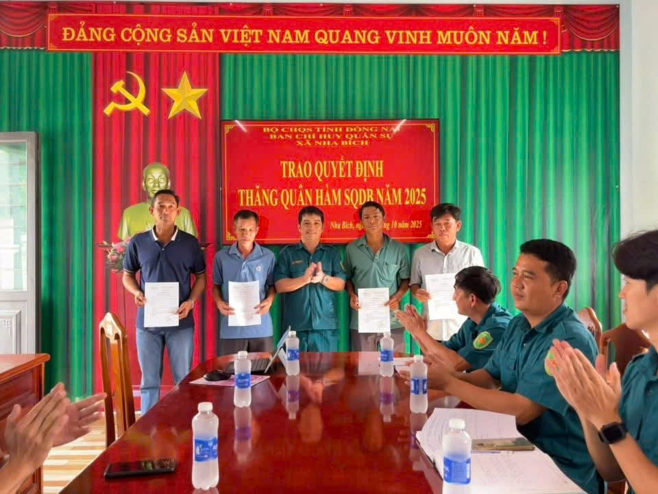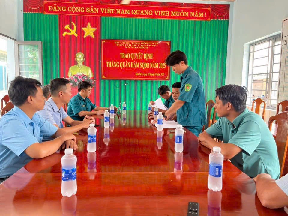 Căn cứ Công văn số 340/BCH-CT ngày 16/10/2025 của Bộ CHQS tỉnh về việc tổ chức trao quyết định thăng quân hàm Sĩ quan Dự bị năm 2025. Vào ngày 28/10/2025, Ban CHQS xã Nha Bích đã triển khai xây dựng kế hoạch tổ chức trao Quyết định thăng quân hàm Sĩ quan dự bị (SQDB) năm 2025. Chủ trì buổi trao quyết định thăng quân hàm SQDB Đồng chí Nguyễn Thành Trung – Chỉ huy trưởng Ban CHQS xã Nha Bích