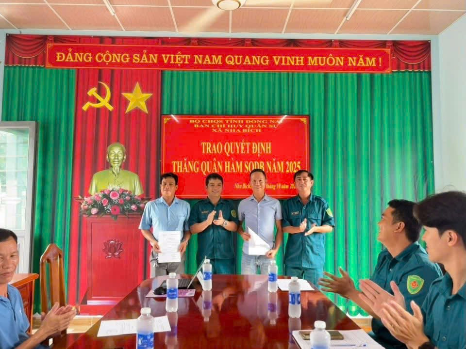 Đại diện Ban CHQS xã Nha Bích trao Quyết định thăng quân hàm Sĩ quan Dự bị năm 2025