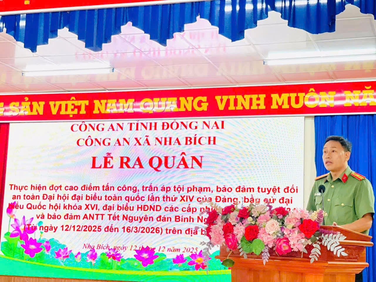 Sáng ngày 12/12/2025, tại Hội trường Công an xã Nha Bích đã long trọng tổ chức Lễ ra quân thực hiện đợt cao điểm tấn công, trấn áp tội phạm; bảo đảm tuyệt đối an ninh, an toàn Đại hội đại biểu toàn quốc lần thứ XIV của Đảng, bầu cử đại biểu Quốc hội khóa XVI và đại biểu Hội đồng nhân dân các cấp nhiệm kỳ 2026–2031, đồng thời bảo đảm an ninh trật tự Tết Nguyên đán Bính Ngọ năm 2026 trên địa bàn xã.
