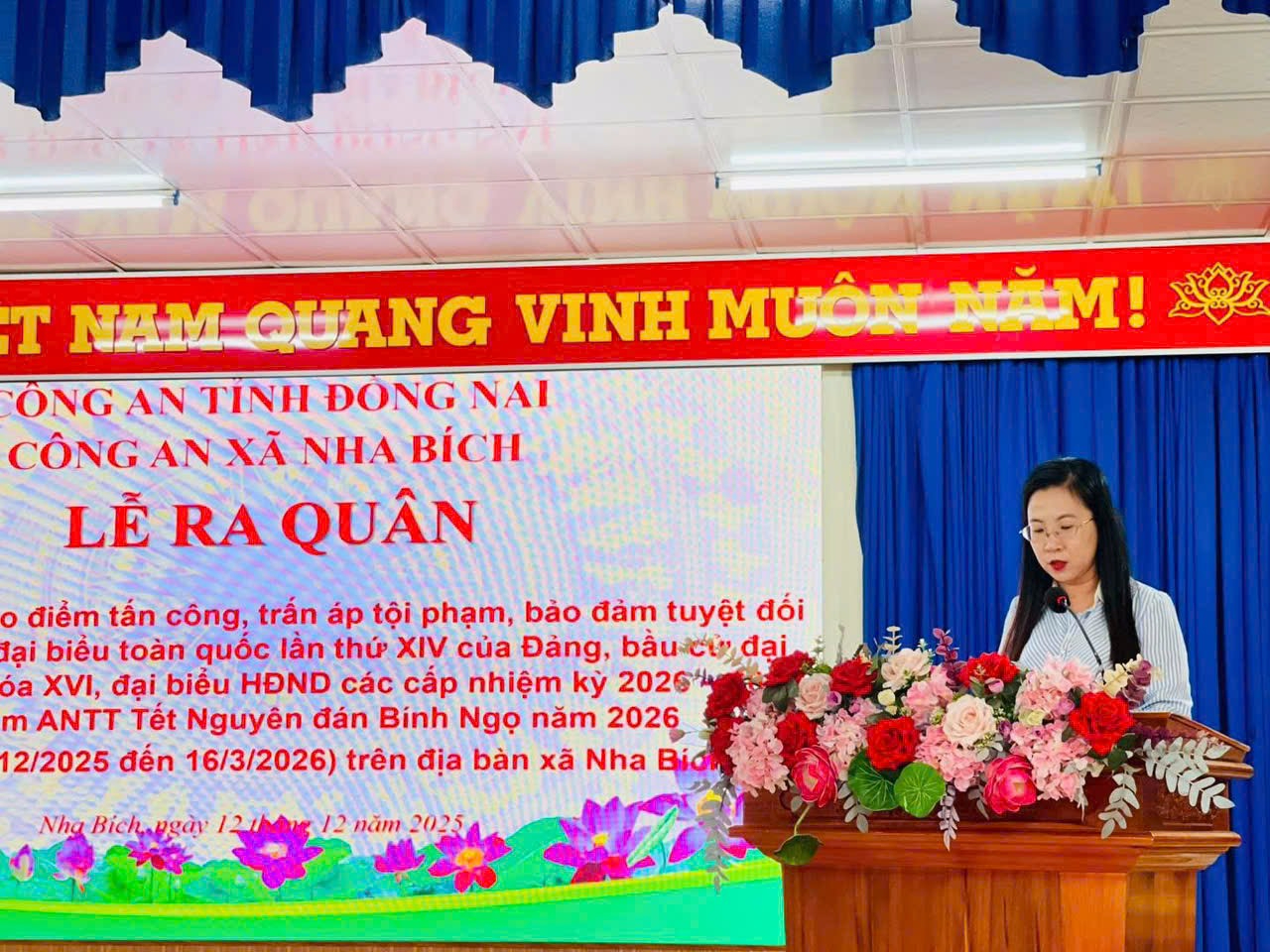 Phát biểu chỉ đạo tại buổi lễ, đồng chí Nguyễn Thị Minh Tiền - Ủy viên Ban thường vụ Đảng ủy, Phó Chủ tịch Ủy ban nhân dân xã Nha Bích, nhấn mạnh đợt cao điểm tấn công, trấn áp tội phạm dịp cuối năm và Tết Nguyên đán có ý nghĩa đặc biệt quan trọng trong việc giữ vững ổn định an ninh chính trị, trật tự an toàn xã hội tại địa phương. Đồng chí đề nghị lực lượng Công an xã tiếp tục phát huy tinh thần chủ động, trách nhiệm, tăng cường bám sát cơ sở, triển khai đồng bộ các biện pháp nghiệp vụ, kịp thời phát hiện, xử lý nghiêm các hành vi vi phạm pháp luật, không để phát sinh điểm nóng về an ninh trật tự, góp phần tạo môi trường an toàn, lành mạnh để nhân dân yên tâm lao động, sản xuất và vui Xuân, đón Tết.