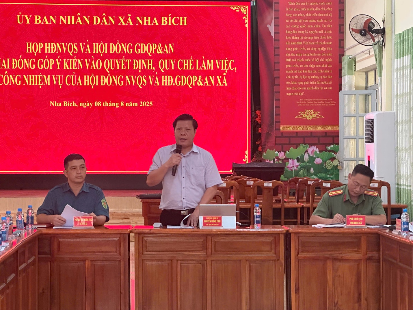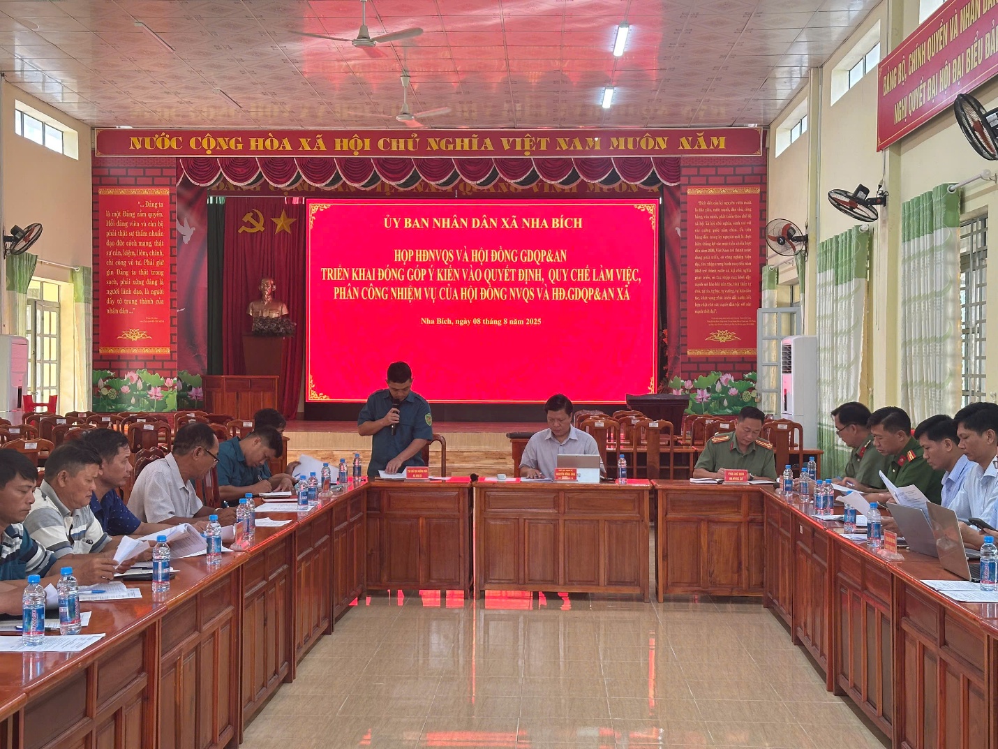 Tại cuộc họp, Chỉ huy trưởng Ban Chỉ huy Quân sự xã đã báo cáo dự thảo về việc thành lập Hội đồng Nghĩa vụ Quân sự xã Nha Bích với 31 thành viên. Báo cáo dự thảo thành lập Hội đồng Giáo dục Quốc phòng – An ninh xã Nha Bích, gồm Hội đồng Giáo dục Quốc phòng – An ninh xã với 30 đồng chí và tổ giúp việc Hội đồng Giáo dục Quốc phòng – An ninh với 4 thành viên. Đồng thời, các thành viên tham gia cuộc họp đã góp các ý kiến vào quyết định, quy chế làm việc, phân công nhiệm vụ của Hội đồng Nghĩa vụ Quân sự xã và Hội đồng Giáo dục Quốc phòng – An ninh xã.