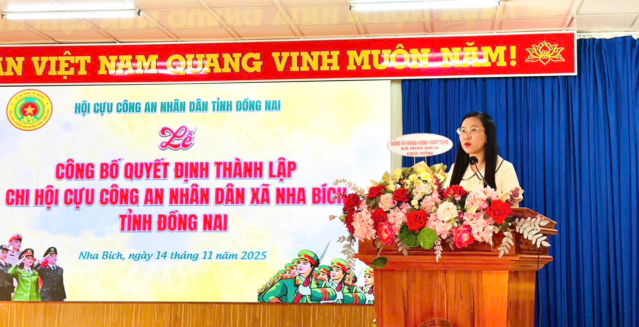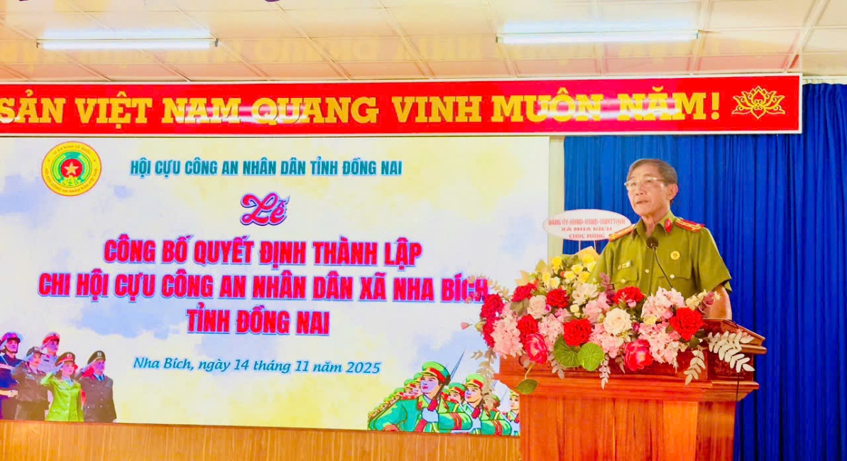 Chiều ngày 14-11-2025, tại trụ sở Công an xã Nha Bích, Hội Cựu Công an nhân dân tỉnh Đồng Nai tổ chức Lễ công bố Quyết định thành lập Chi hội Cựu Công an nhân dân xã Nha Bích. Dự Lễ công bố có Đại tá Lê Đức Long - Phó chủ tịch Thường trực Hội Cựu CAND tỉnh Đồng Nai; Đồng chí Lương Văn Sơn – Phó Trưởng Công an xã; Ủy viên Ban thường vụ, Phó Chủ tịch UBND xã Nguyễn Thị Minh Tiền và cán bộ, chiến sĩ lực lượng công an nhân dân, cựu công an nhân dân trên địa bàn xã.