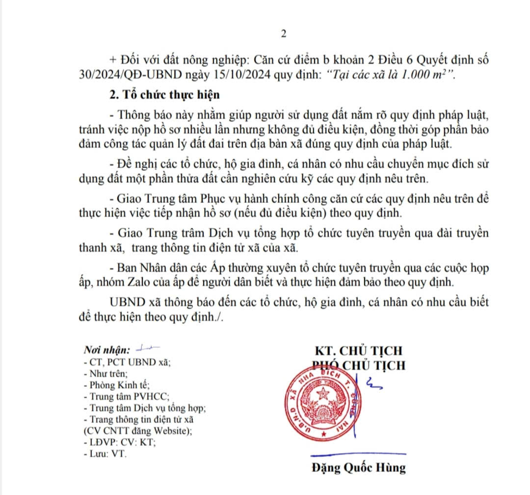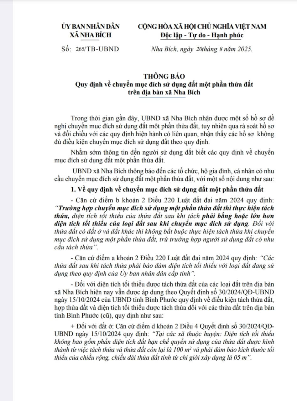 UBND xã Nha Bích Thông báo Quy định về chuyển mục đích sử dụng đất một phần thửa đất trên địa bàn xã Nha Bích. Xin Thông báo đến các tổ chức, hộ gia đình, các cá nhân có nhu cầu đăng ký chuyển mục đích sử dụng đất một phần thửa đất trên địa bàn xã Nha Bích được biết để thực hiện đúng theo các quy định, nhằm giảm thiểu thời gian đi lại trong quá trình giải quyết các thủ tục.