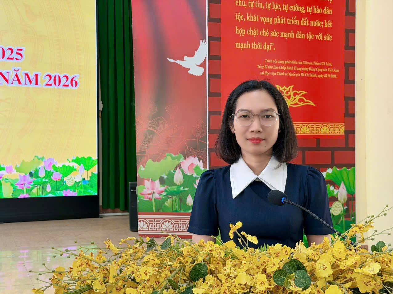 Đồng chí Nguyễn Thị Minh Tiền – UVBTV Đảng bộ xã - Phó Bí thư Đảng uỷ UBND xã báo cáo đánh giá kết quả thực hiện Nghị quyết năm 2025