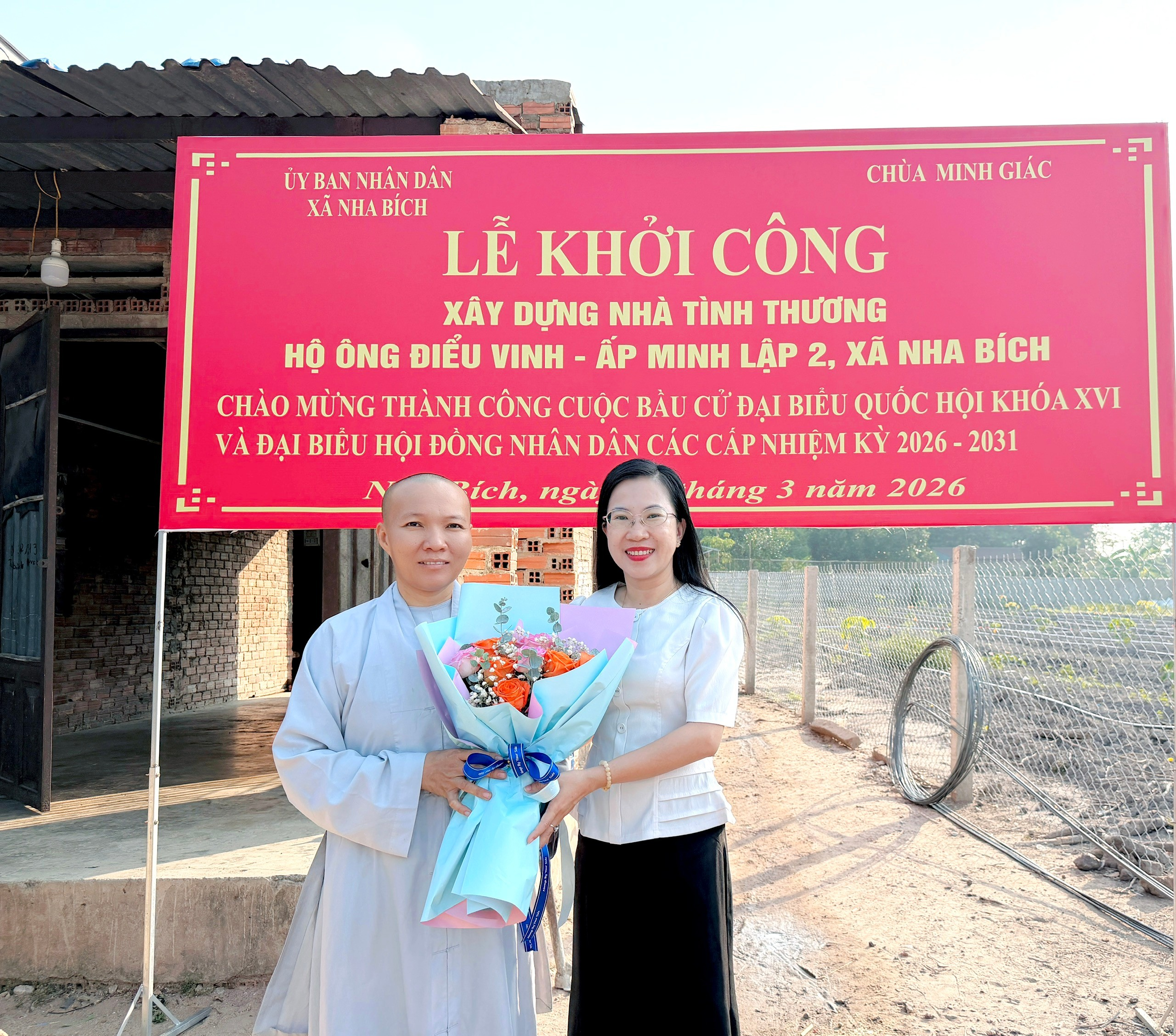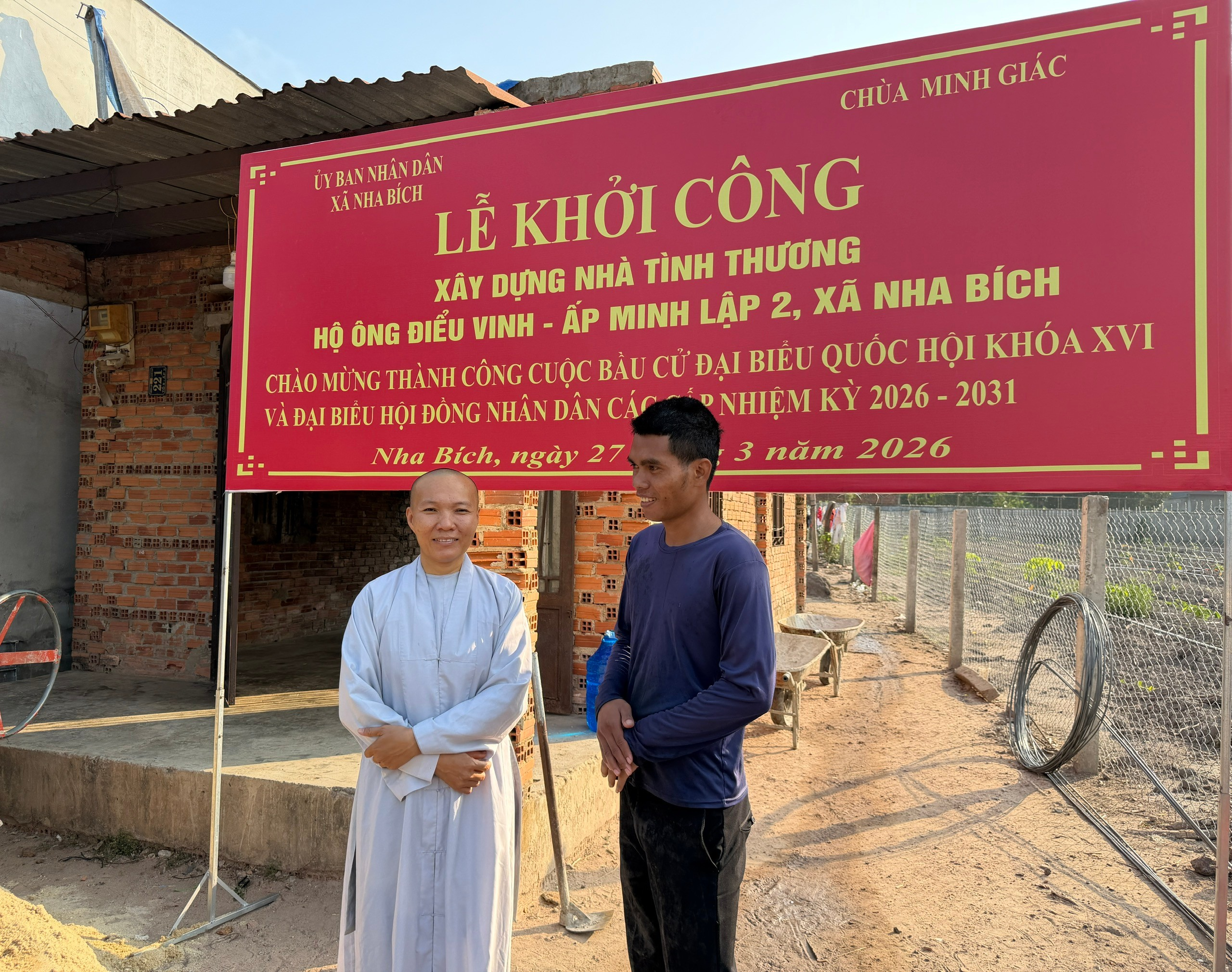 Thiết thực chào mừng thành công cuộc bầu cử đại biểu Quốc hội khóa XVI và đại biểu Hội đồng nhân dân các cấp nhiệm kỳ 2026–2031. Sáng ngày 27/3/2026, tại Tổ 9, ấp Minh Lập 2, Ủy ban nhân dân xã Nha Bích phối hợp cùng Chùa Minh Giác và Ban điều hành khu dân cư tổ chức Lễ khởi công xây dựng nhà tình thương cho em Điểu Vinh – công dân có hoàn cảnh đặc biệt khó khăn trên địa bàn.