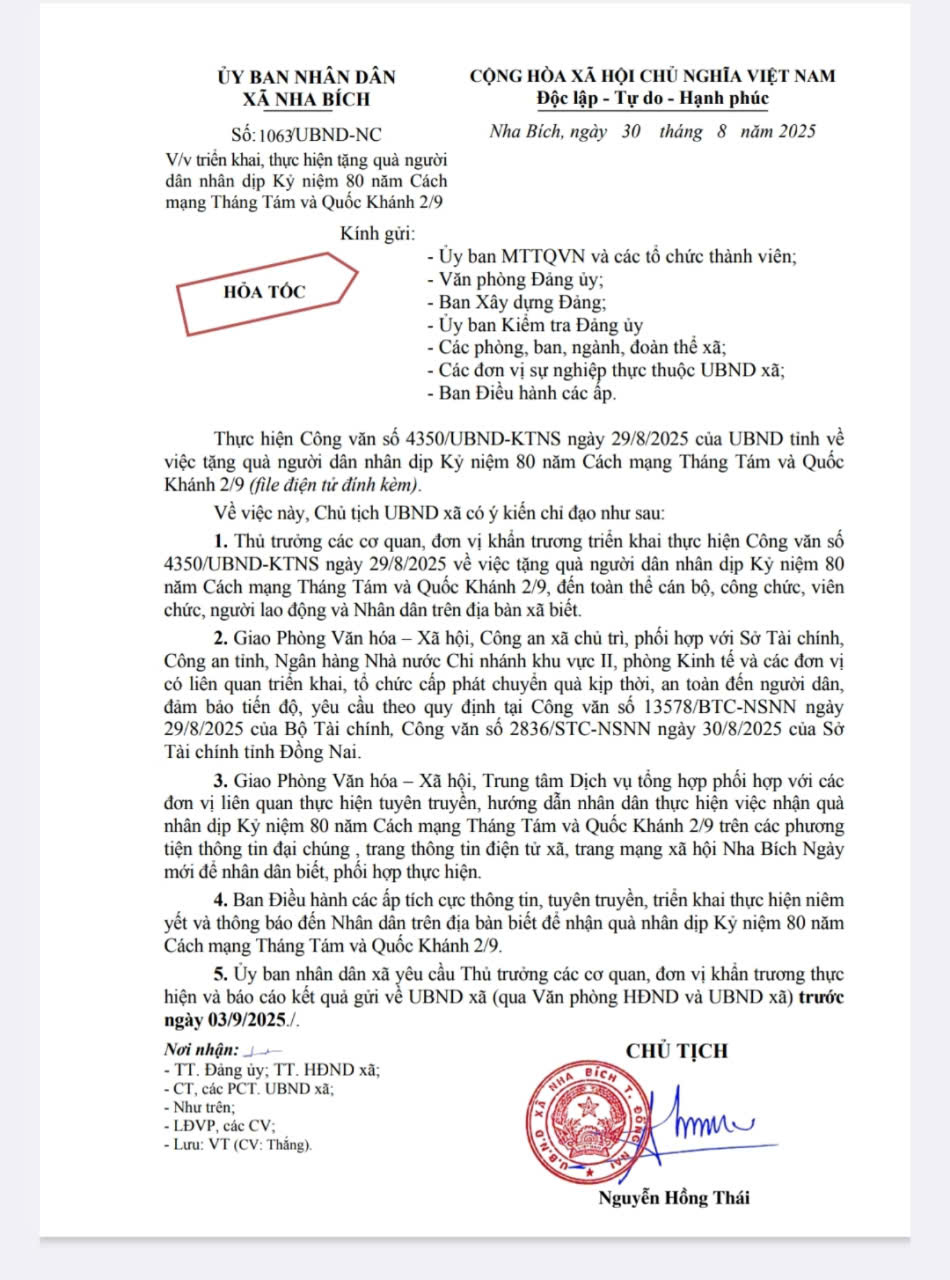 Thực hiện Công văn số 4350/UBND-KTNS của Ủy ban Nhân dân tỉnh về việc tặng quà cho người dân nhân dịp Kỷ niệm 80 năm Cách mạng Tháng Tám và Quốc khánh 2/9, Ủy ban Nhân dân xã Nha Bích trân trọng thông báo: