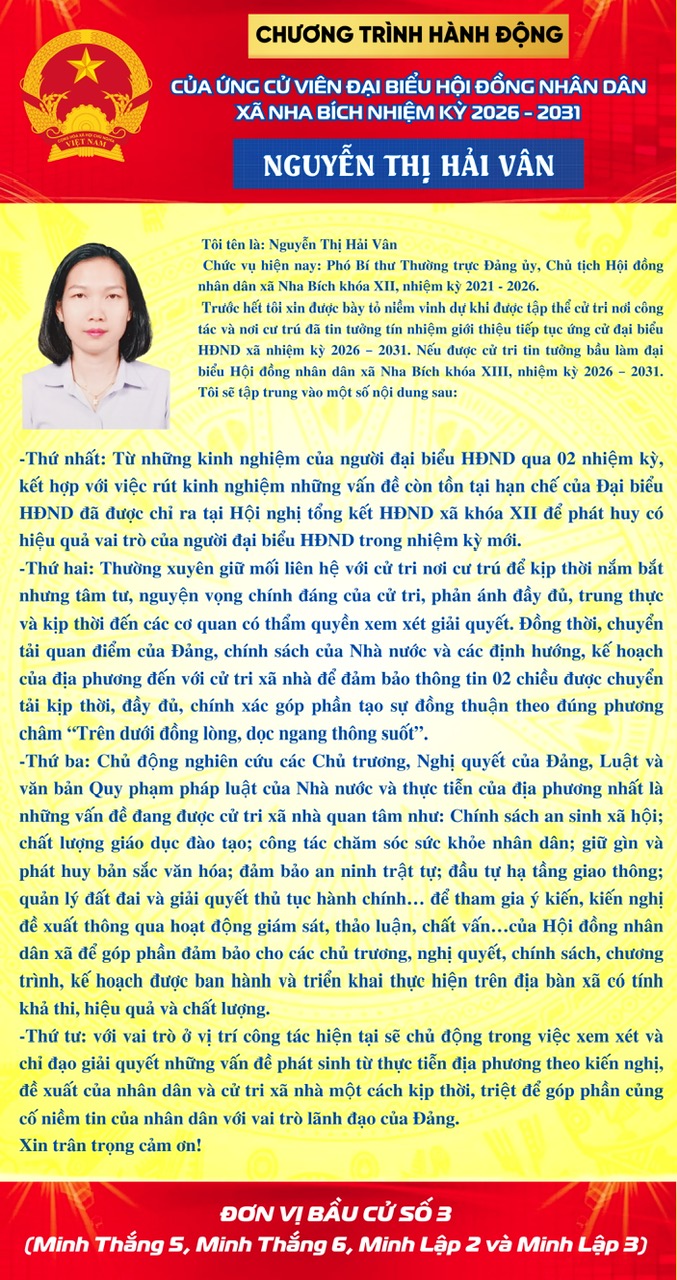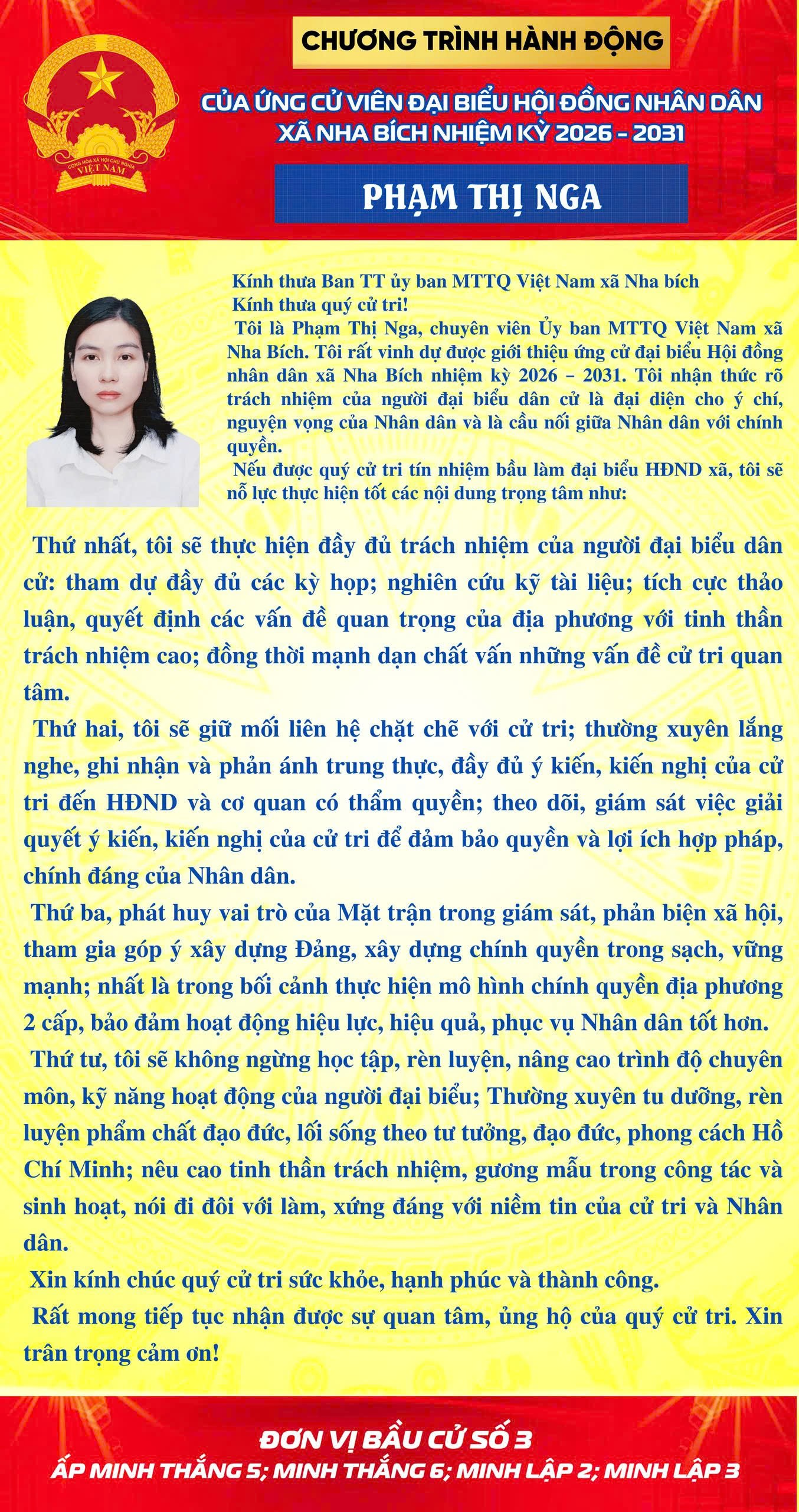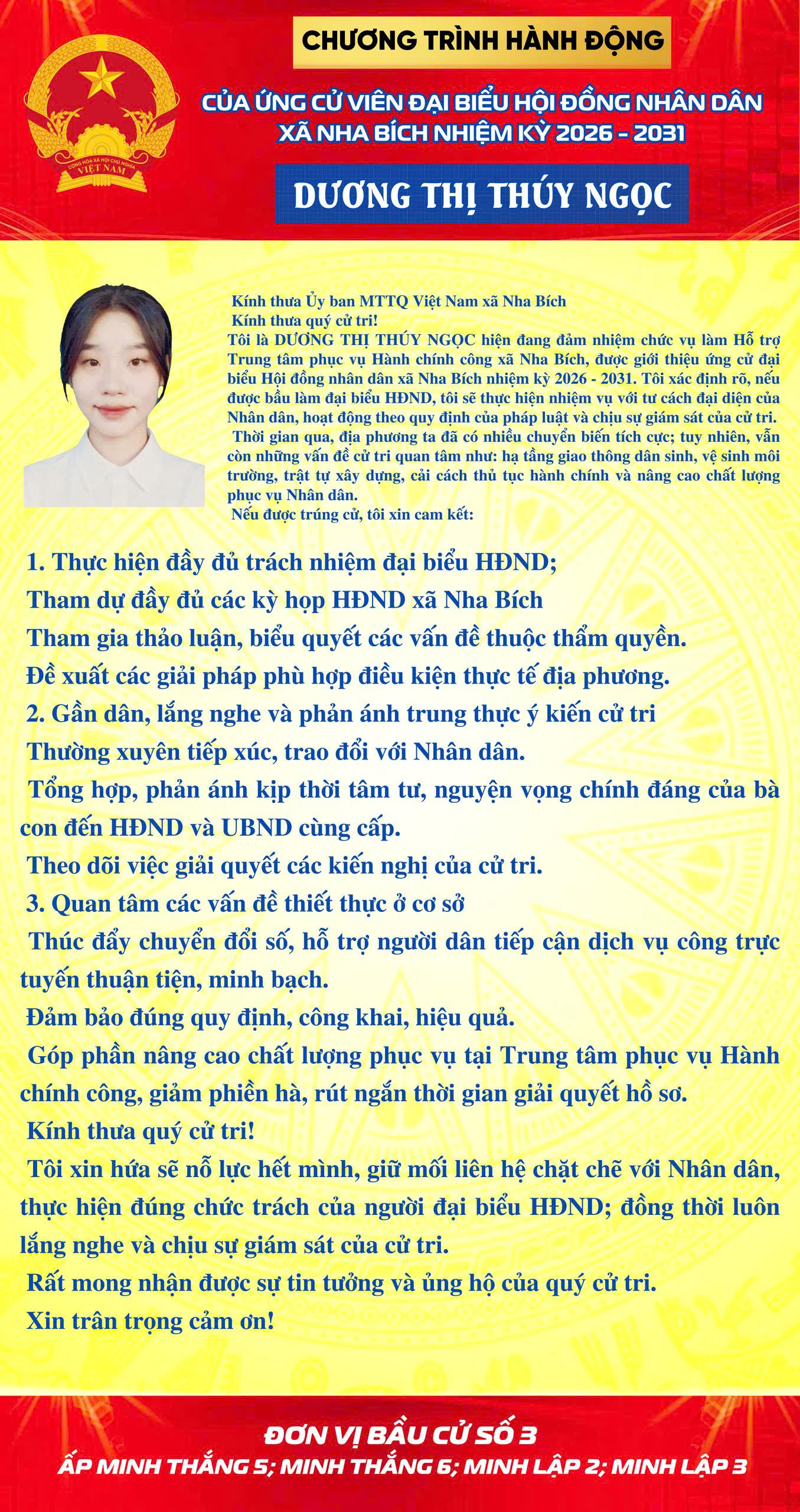 CHƯƠNG TRÌNH HÀNH ĐỘNG CỦA CÁC ỨNG CỬ VIÊN ĐẠI BIỂU HĐND XÃ NHA BÍCH NHIỆM KỲ 2026-2031 TẠI KHU VỰC BẦU CỬ SỐ 3