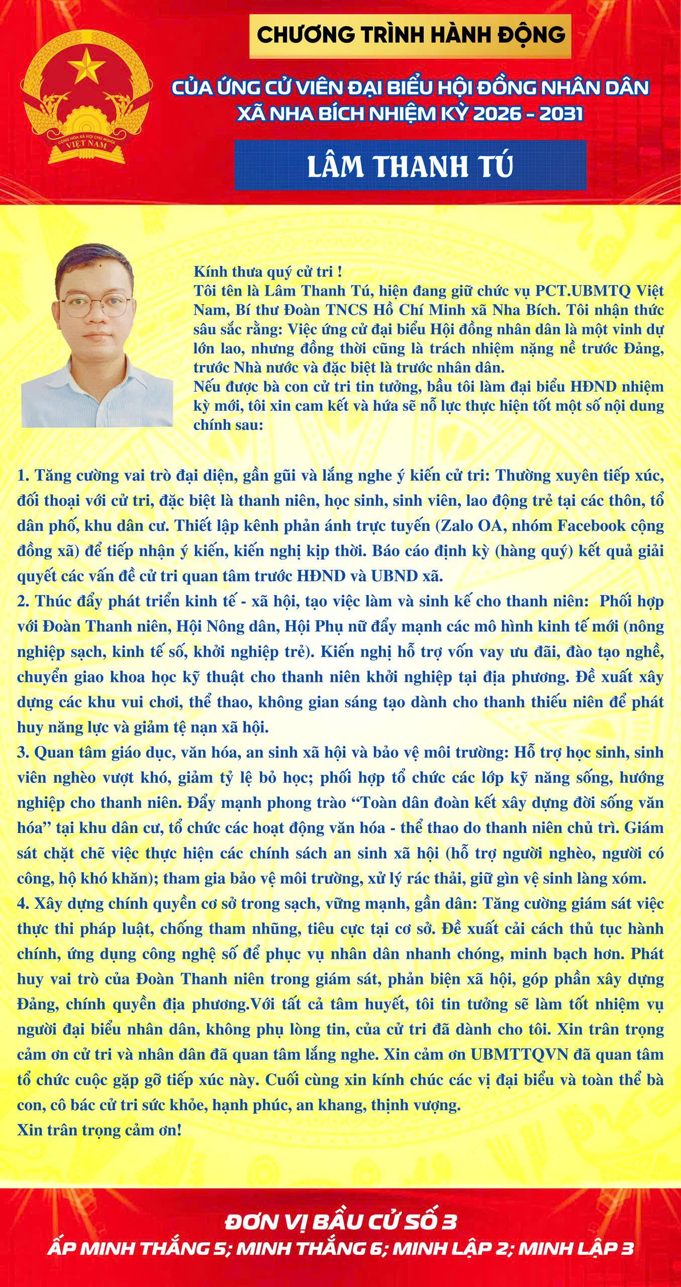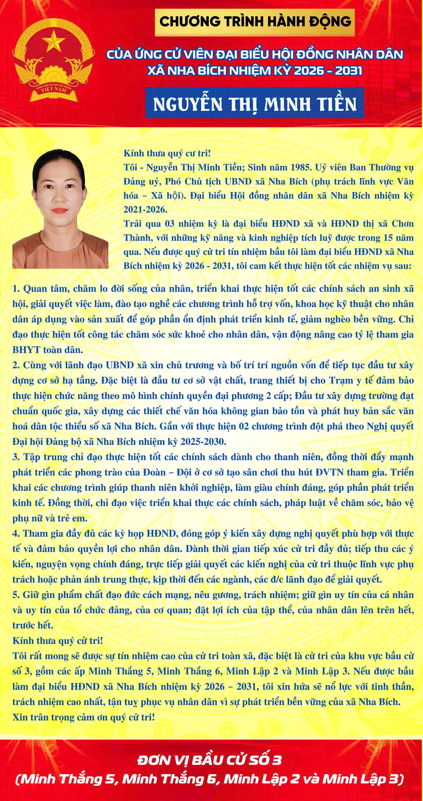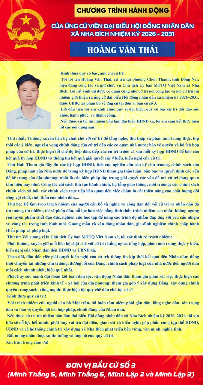 CHƯƠNG TRÌNH HÀNH ĐỘNG CỦA CÁC ỨNG CỬ VIÊN ĐẠI BIỂU HĐND XÃ NHA BÍCH NHIỆM KỲ 2026-2031 TẠI KHU VỰC BẦU CỬ SỐ 3