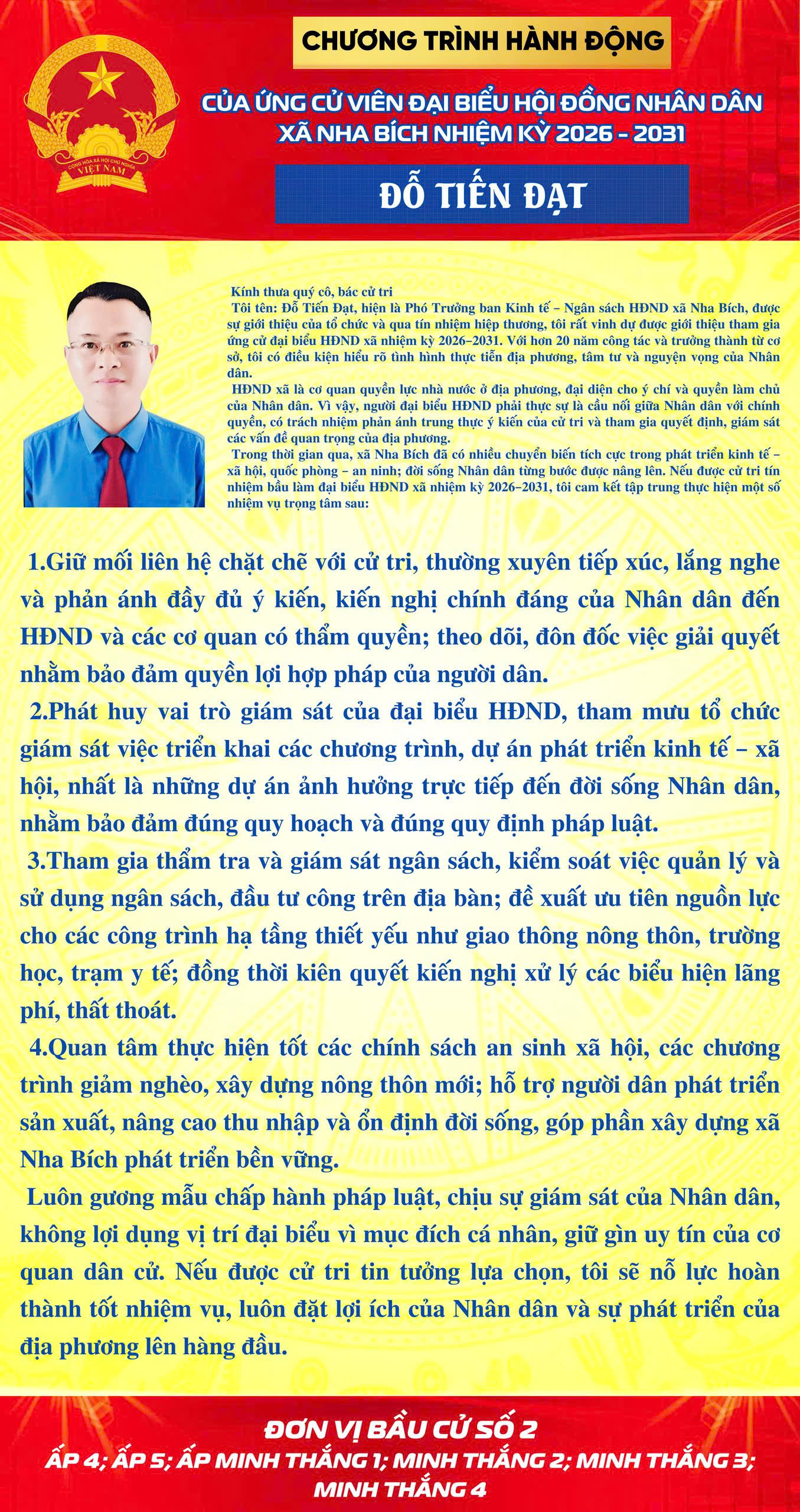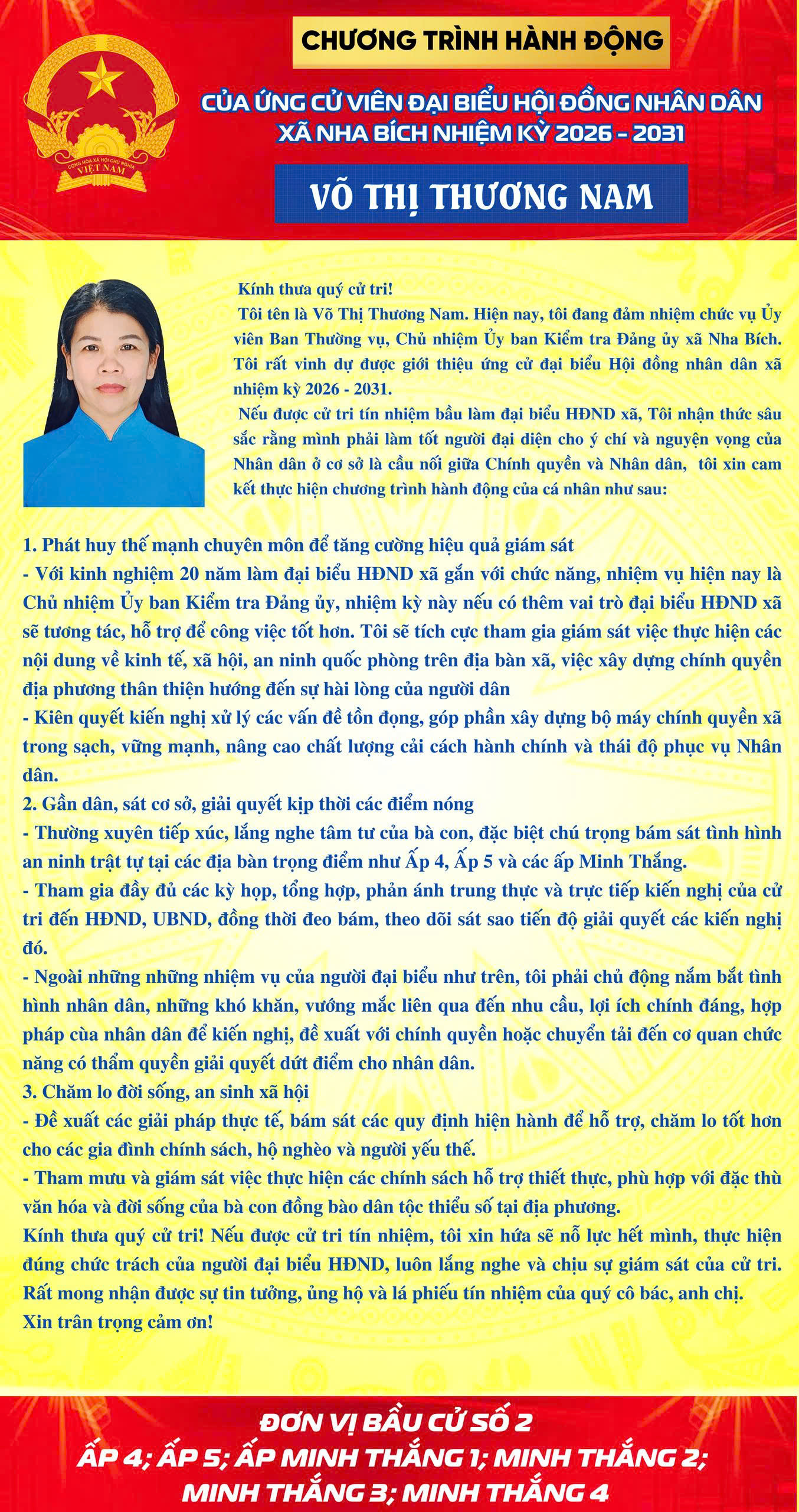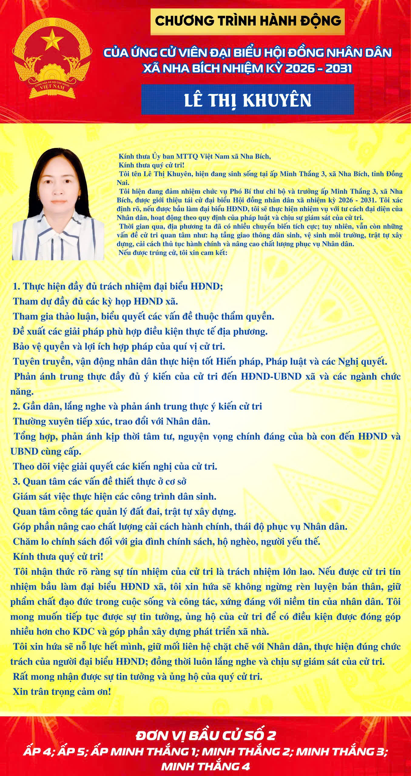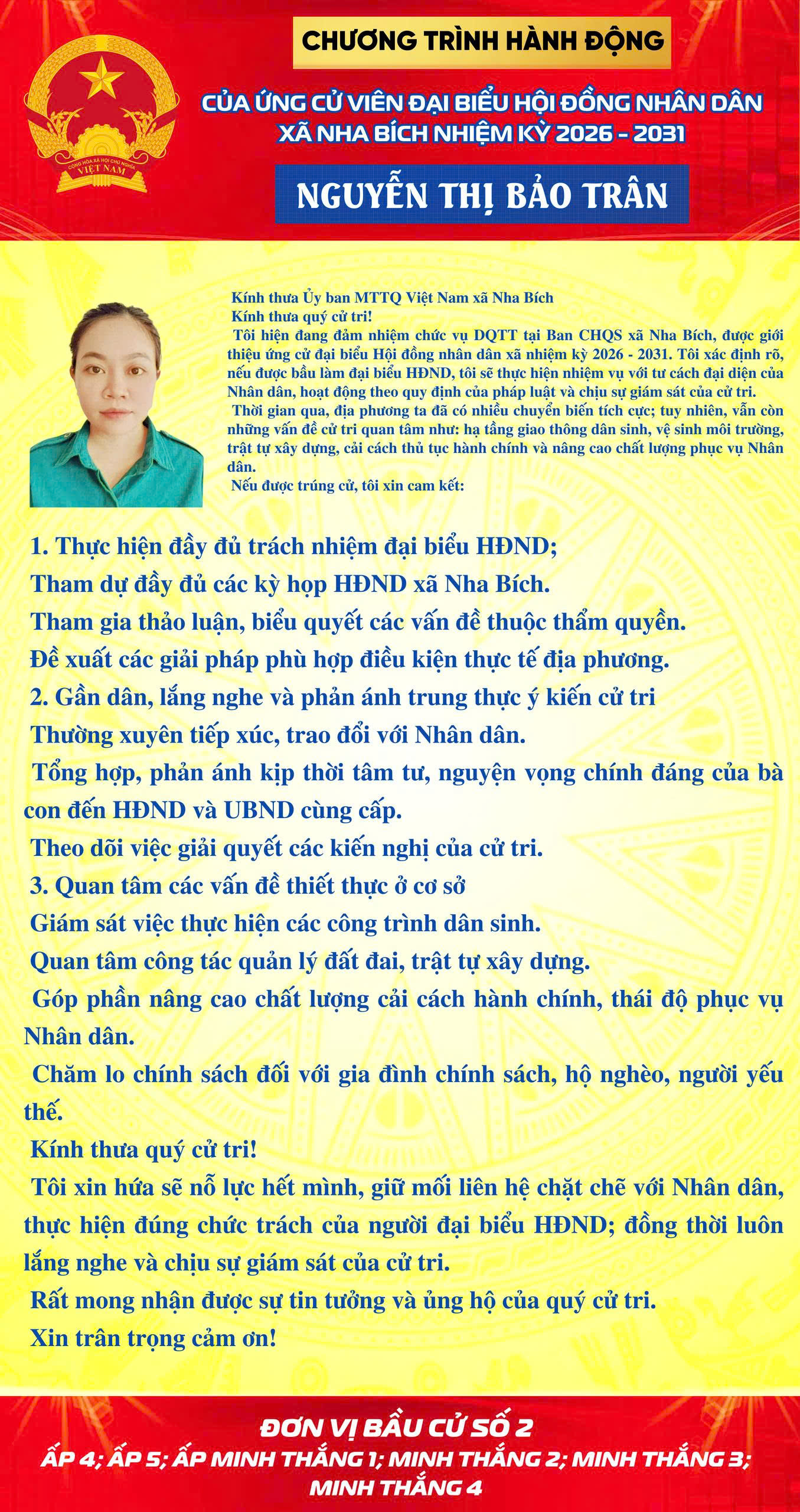 CHƯƠNG TRÌNH HÀNH ĐỘNG CỦA CÁC ỨNG CỬ VIÊN ĐẠI BIỂU HĐND XÃ NHA BÍCH NHIỆM KỲ 2026-2031 TẠI KHU VỰC BẦU CỬ SỐ 2