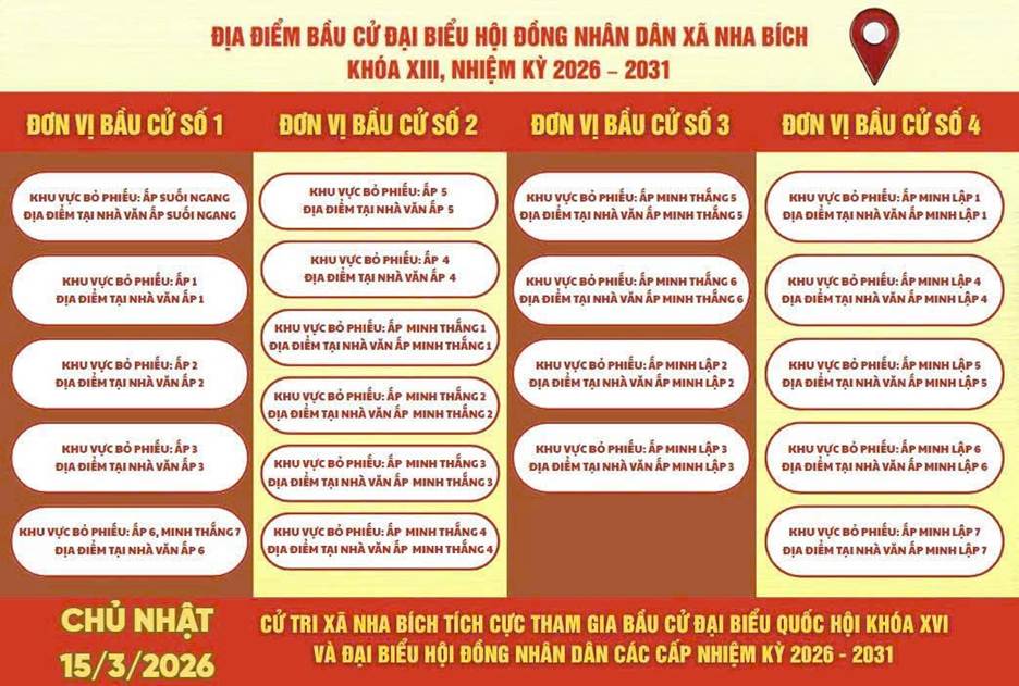 Cụ thể, xã Nha Bích có 4 đơn vị bầu cử với các khu vực bỏ phiếu như sau: