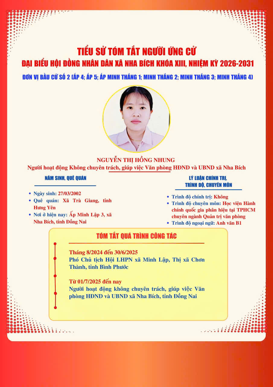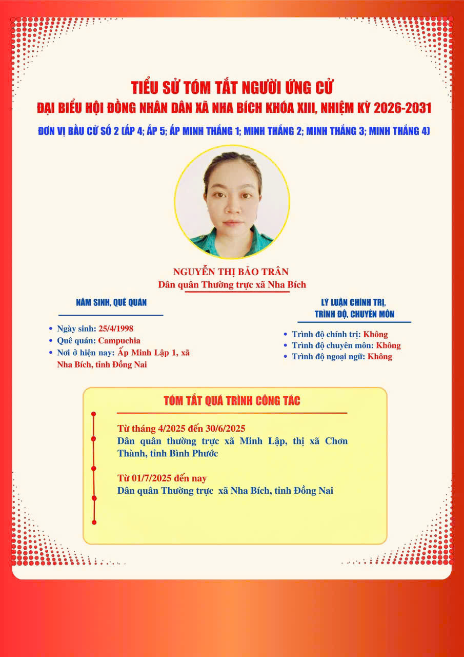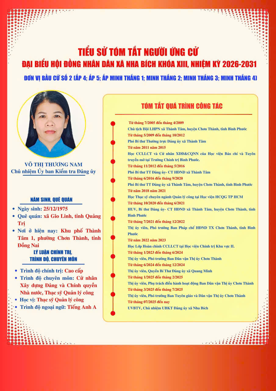 DANH SÁCH VÀ TIỂU SỬ TÓM TẮT NHỮNG NGƯỜI ỨNG CỬ ĐẠI BIỂU HĐND XÃ NHA BÍCH KHOÁ XIII, NHIỆM KỲ 2026-2031 TẠI ĐƠN VỊ BẦU CỬ SỐ 2, GỒM CÁC KHU VỰC BỎ PHIẾU: ẤP 4, ẤP 5, ẤP MINH THẮNG 1, ẤP MINH THẮNG 2, ẤP MINH THẮNG 3 VÀ ẤP MINH THẮNG 4