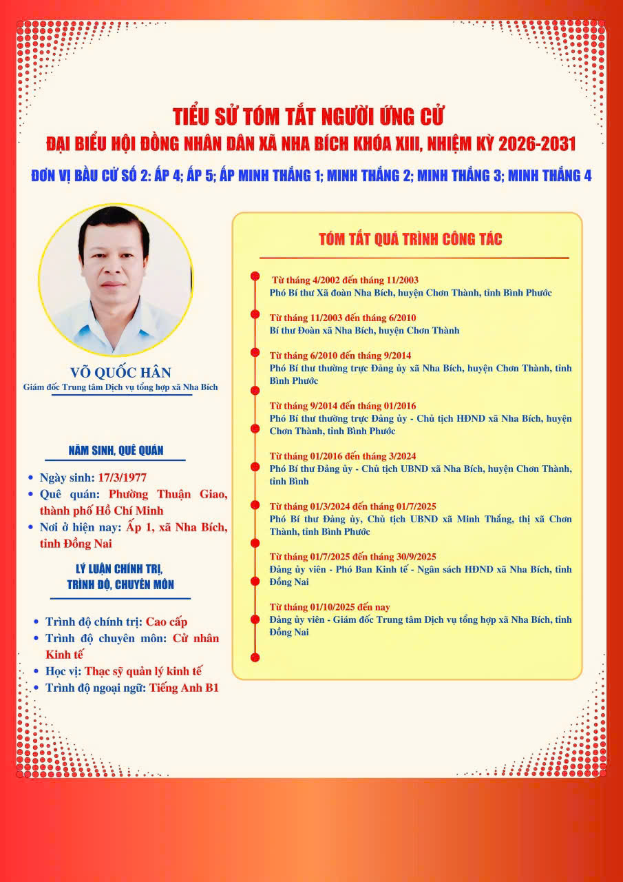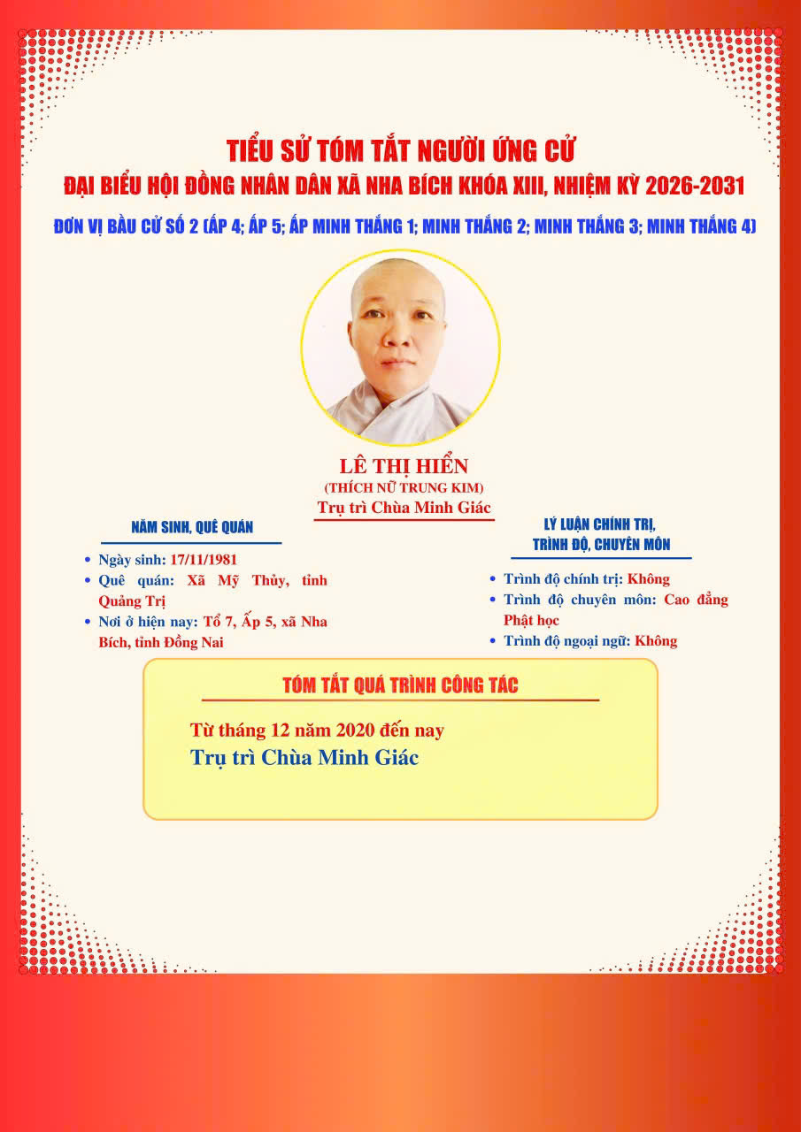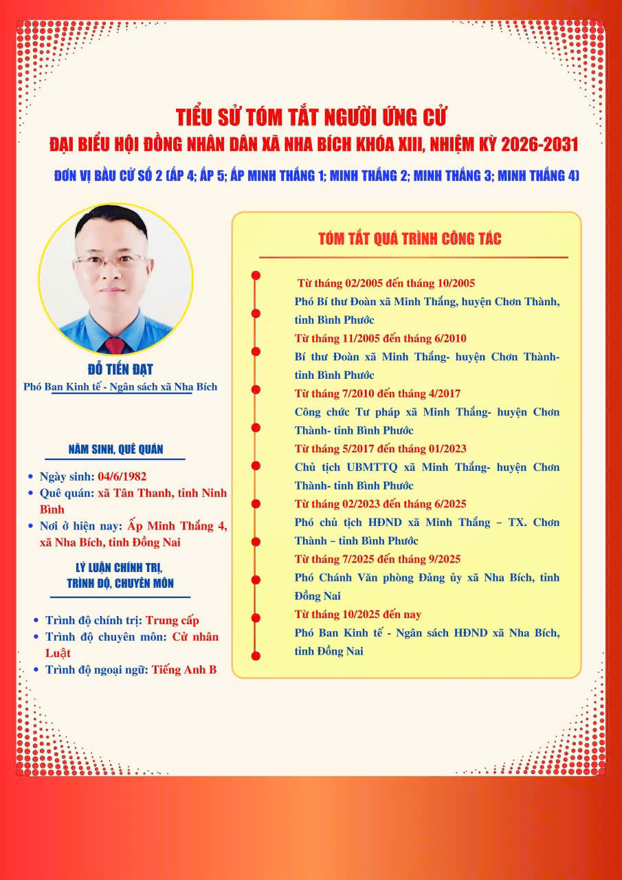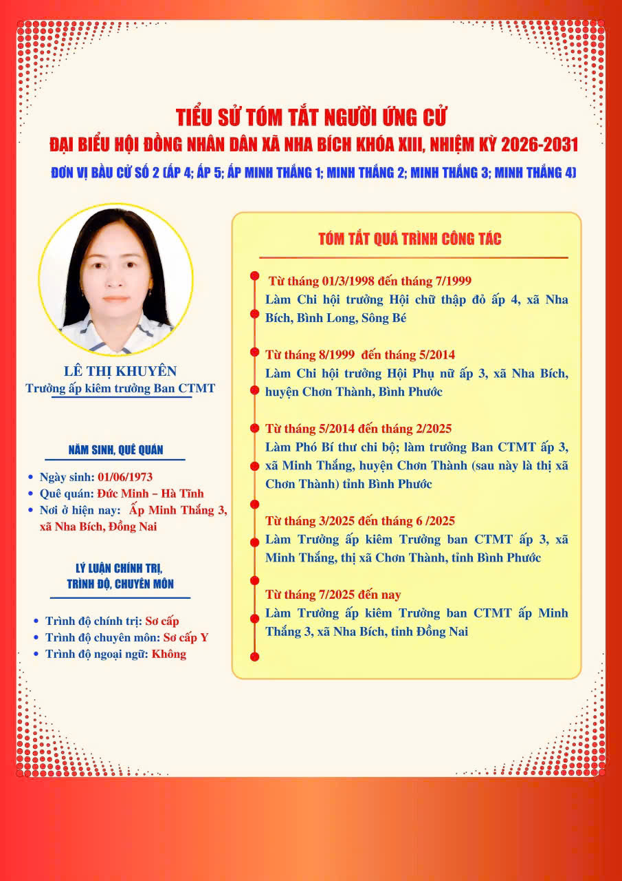 DANH SÁCH VÀ TIỂU SỬ TÓM TẮT NHỮNG NGƯỜI ỨNG CỬ ĐẠI BIỂU HĐND XÃ NHA BÍCH KHOÁ XIII, NHIỆM KỲ 2026-2031 TẠI ĐƠN VỊ BẦU CỬ SỐ 2, GỒM CÁC KHU VỰC BỎ PHIẾU: ẤP 4, ẤP 5, ẤP MINH THẮNG 1, ẤP MINH THẮNG 2, ẤP MINH THẮNG 3 VÀ ẤP MINH THẮNG 4