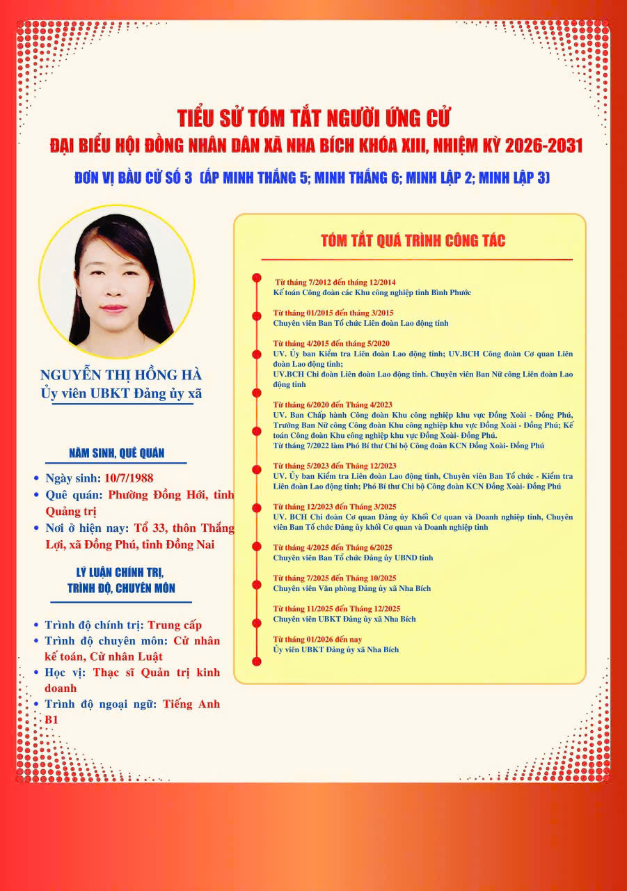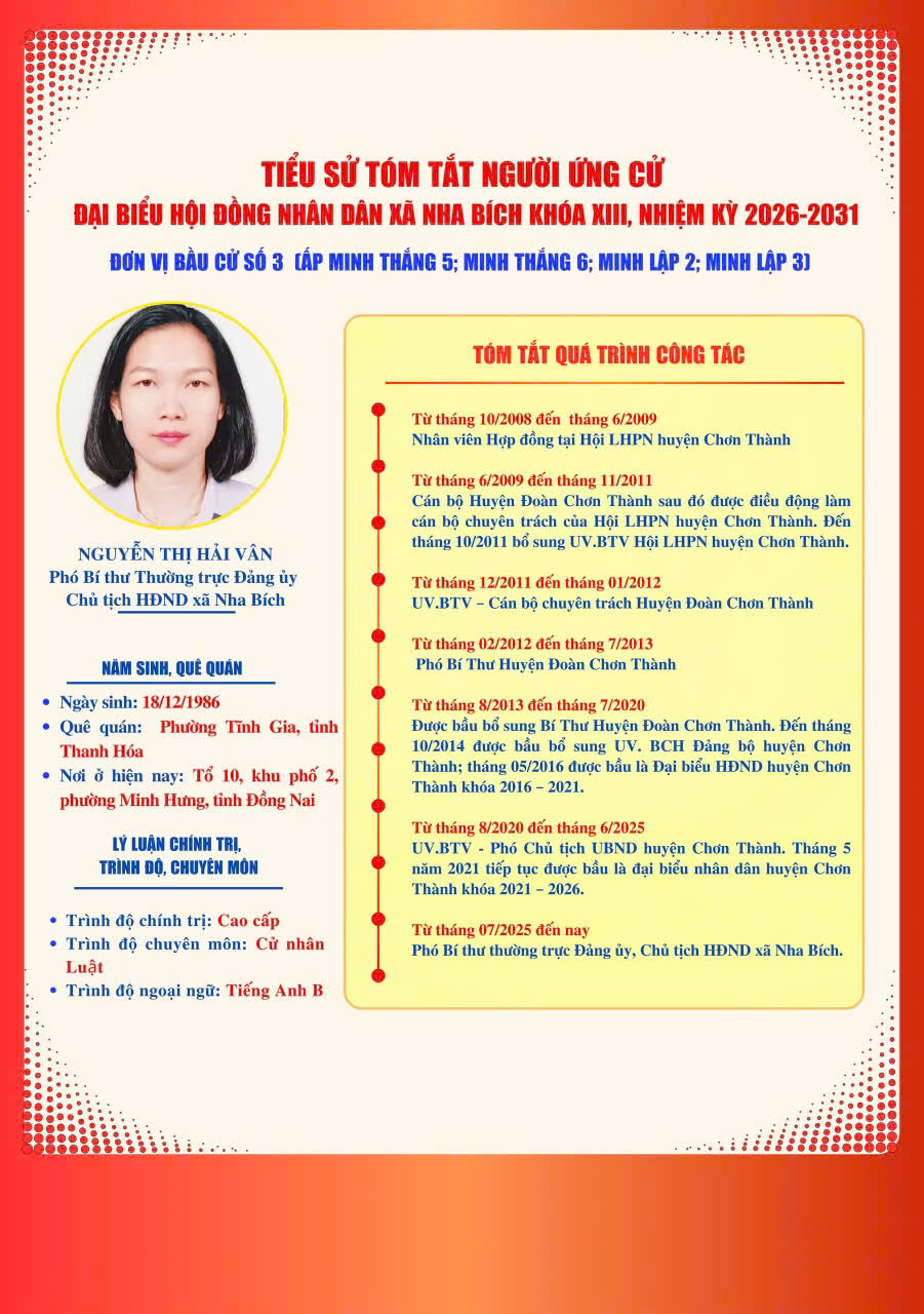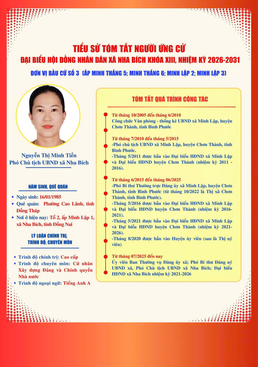 DANH SÁCH VÀ TIỂU SỬ TÓM TẮT NHỮNG NGƯỜI ỨNG CỬ ĐẠI BIỂU HĐND XÃ NHA BÍCH KHOÁ XIII, NHIỆM KỲ 2026-2031 TẠI ĐƠN VỊ BẦU CỬ SỐ 3, GỒM CÁC KHU VỰC BỎ PHIẾU ẤP MINH THẮNG 5, ẤP MINH THẮNG 6, ẤP MINH LẬP 2 VÀ ẤP MINH LẬP 3