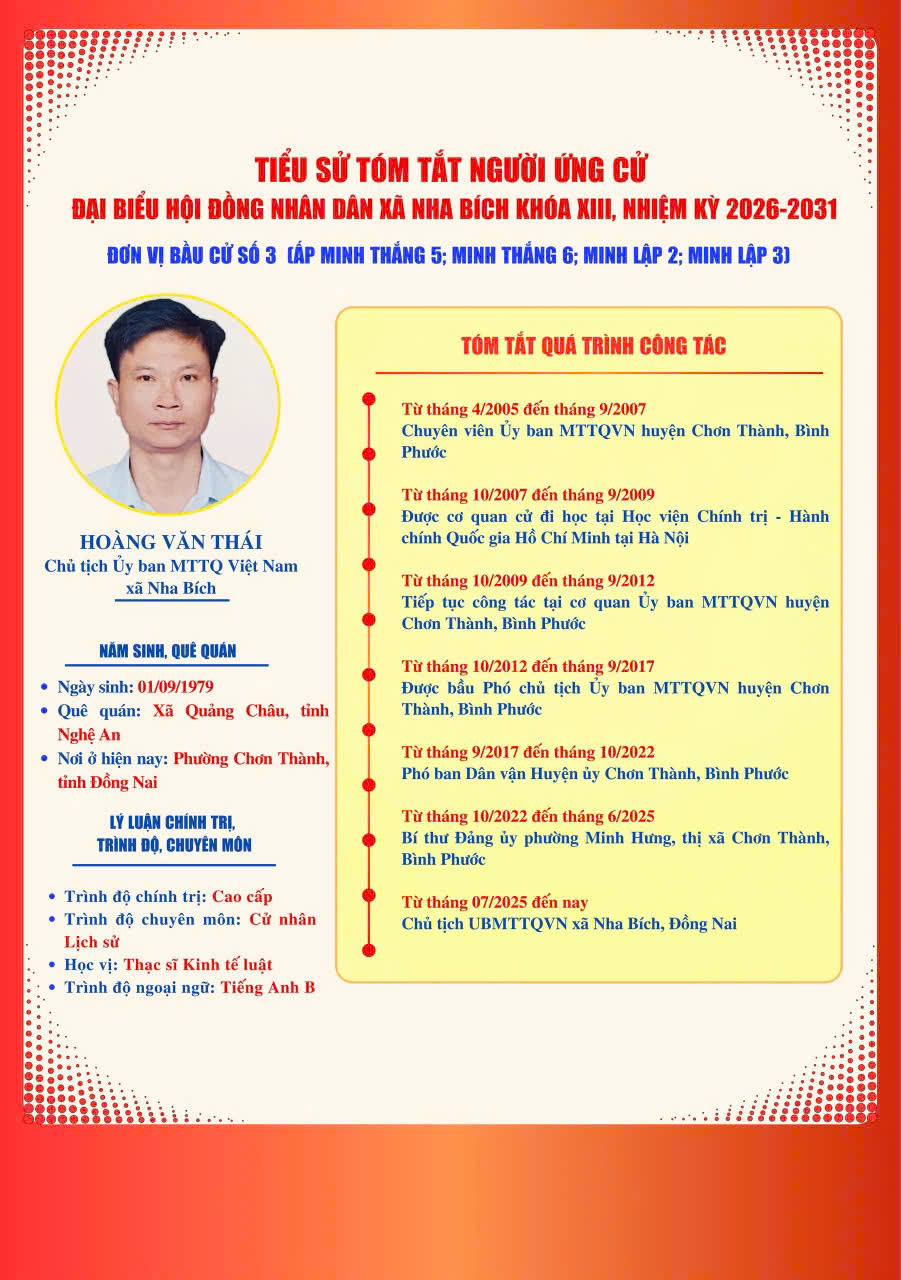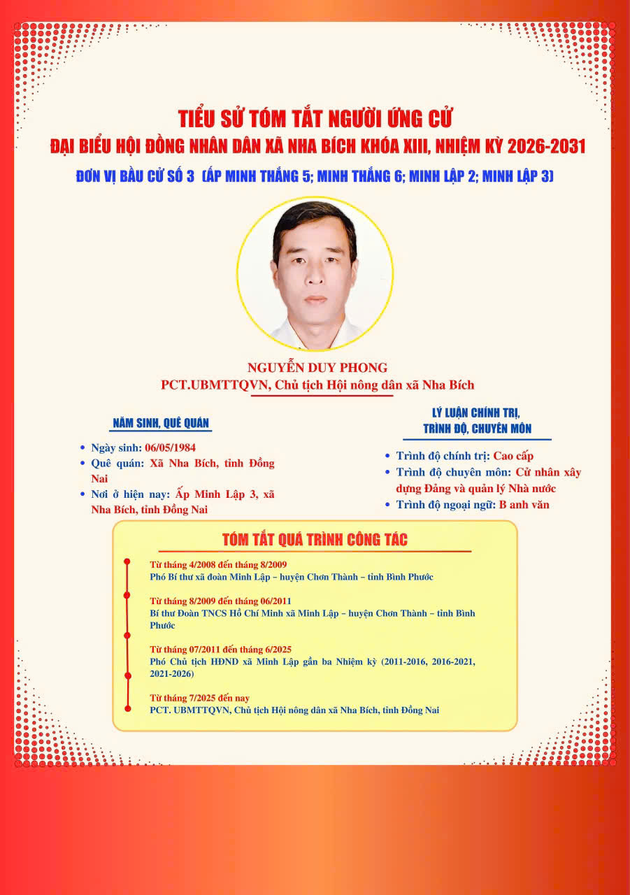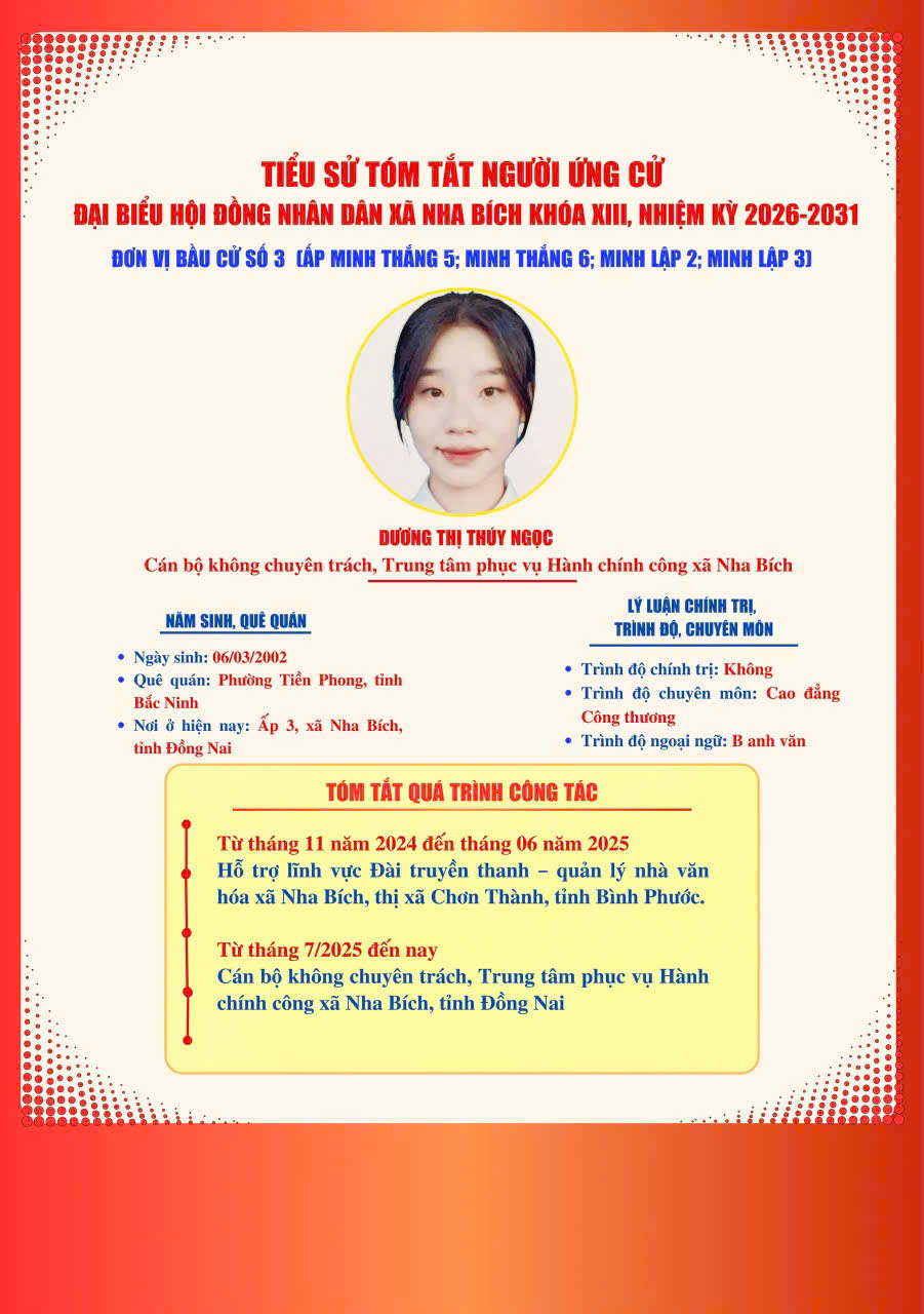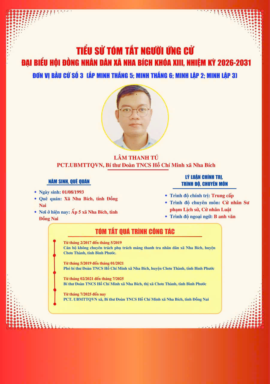 DANH SÁCH VÀ TIỂU SỬ TÓM TẮT NHỮNG NGƯỜI ỨNG CỬ ĐẠI BIỂU HĐND XÃ NHA BÍCH KHOÁ XIII, NHIỆM KỲ 2026-2031 TẠI ĐƠN VỊ BẦU CỬ SỐ 3, GỒM CÁC KHU VỰC BỎ PHIẾU ẤP MINH THẮNG 5, ẤP MINH THẮNG 6, ẤP MINH LẬP 2 VÀ ẤP MINH LẬP 3