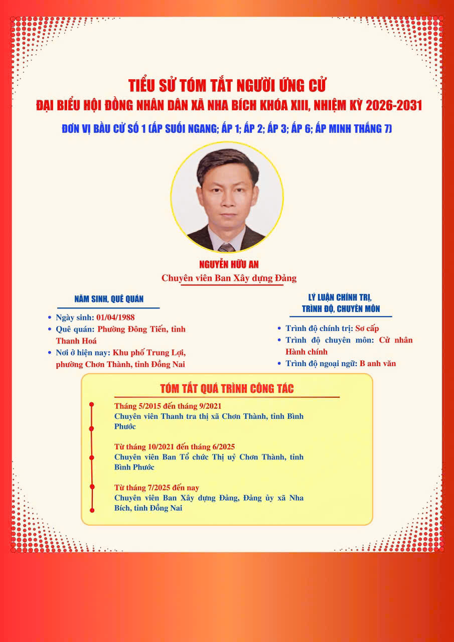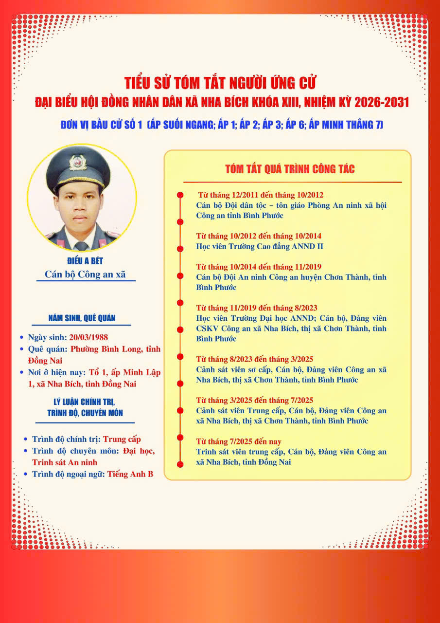 DANH SÁCH VÀ TIỂU SỬ TÓM TẮT NHỮNG NGƯỜI ỨNG CỬ ĐẠI BIỂU HĐND XÃ NHA BÍCH KHOÁ XIII NHIỆM KỲ 2026-2031 TẠI ĐƠN VỊ BẦU CỬ SỐ 1, GỒM CÁC KHU VỰC BỎ PHIẾU ẤP SUỐI NGANG, ẤP 1, ẤP 2, ẤP 3, ẤP 6 VÀ ẤP MINH THẮNG 7