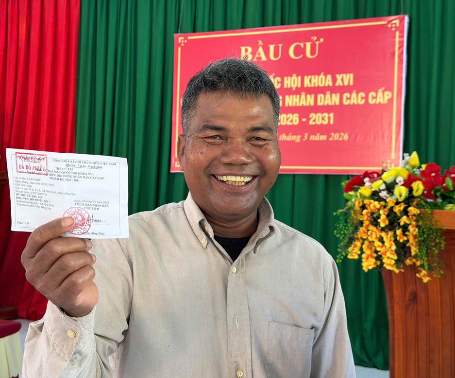 Giữa không khí trang trọng nhưng rộn ràng của Ngày bầu cử, tại khu vực bầu cử ấp 5 xã Nha Bích xuất hiện nụ cười rạng rỡ của một cử tri người Dân tộc Khmer khi nâng trên tay tấm thẻ đã được đóng dấu “Đã bỏ phiếu” trở thành một khoảnh khắc thật đẹp và ý nghĩa.