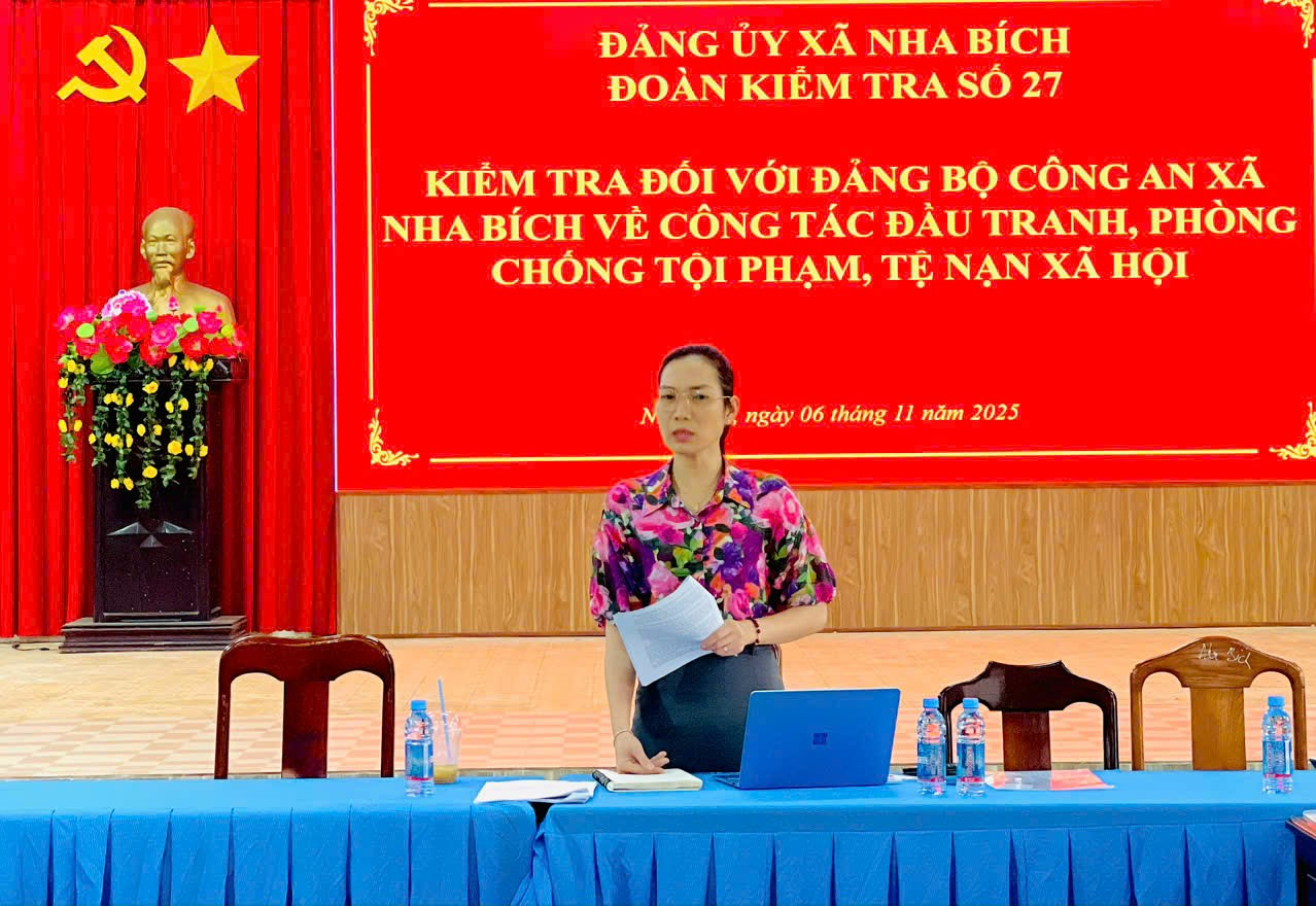 Ngày 06/11/2025, Đảng uỷ xã Nha Bích (Đoàn Kiểm tra số 17) Kiểm tra Đảng bộ Công an xã về công tác đấu tranh, phòng chống tội phạm, tệ nạn xã hội. Bà Nguyễn Thị Hải Vân – Phó Bí thư Thường trực Đảng uỷ - Chủ tịch HĐND xã làm Trưởng đoàn. Cùng tham dự có thành viên Đoàn kiểm tra số 17 và Ban Chấp hành Đảng bộ Công an xã Nha Bích.
