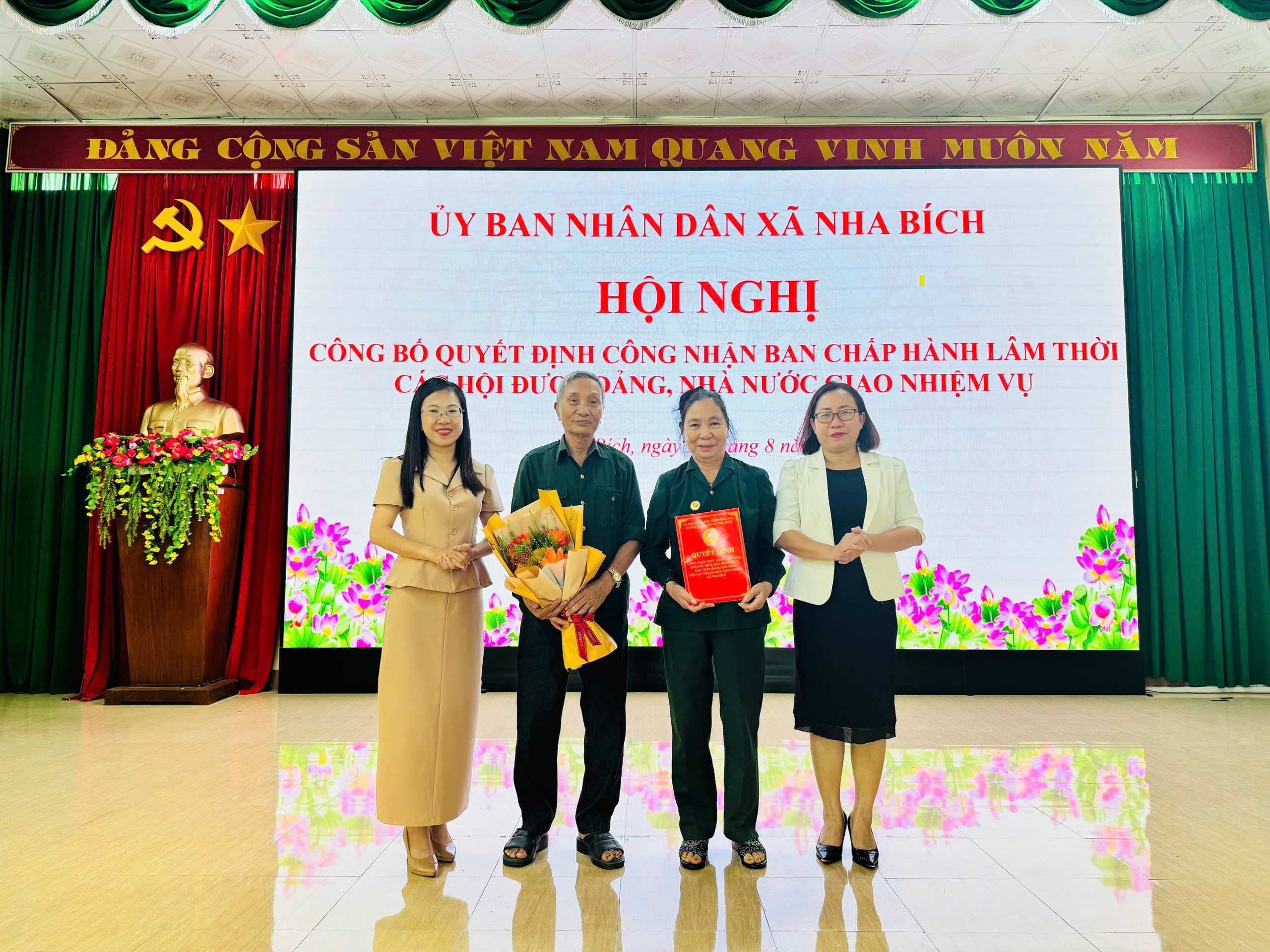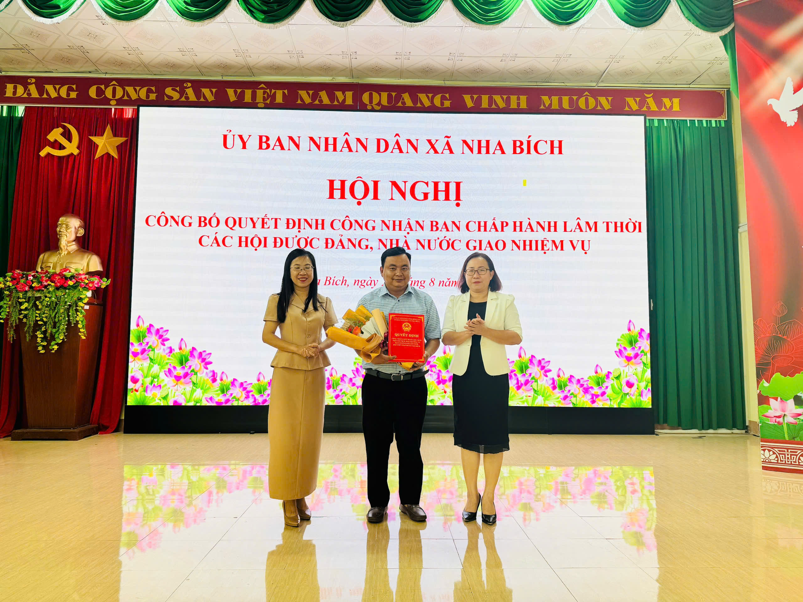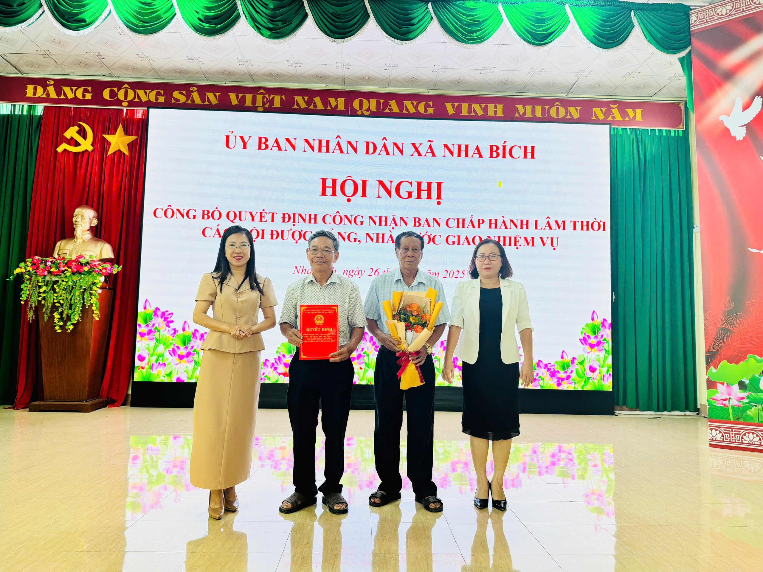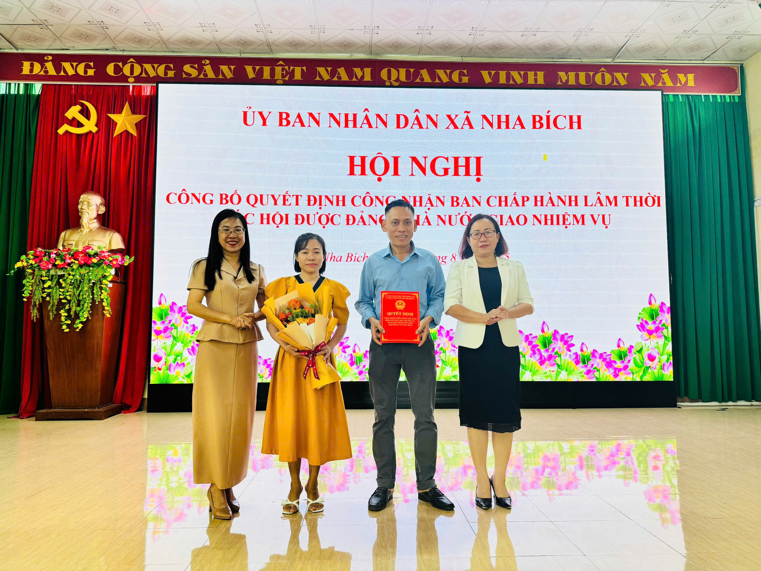 Sáng ngày 26 tháng 8 năm 2025, Ủy ban nhân dân xã Nha Bích đã tổ chức Hội nghị công bố Quyết định công nhận Ban Chấp hành lâm thời các Hội được Đảng, Nhà nước giao nhiệm vụ trên địa bàn xã. Bà Nguyễn Thị Minh Tiền – Phó Chủ tịch UBND xã Chủ trì hội nghị. Tham dự hội nghị có Lãnh Phòng Văn hóa – Xã hội, các đại biểu là Chủ tịch, Phó Chủ tịch và Ủy viên Ban Thường vụ lâm thời của các Hội.