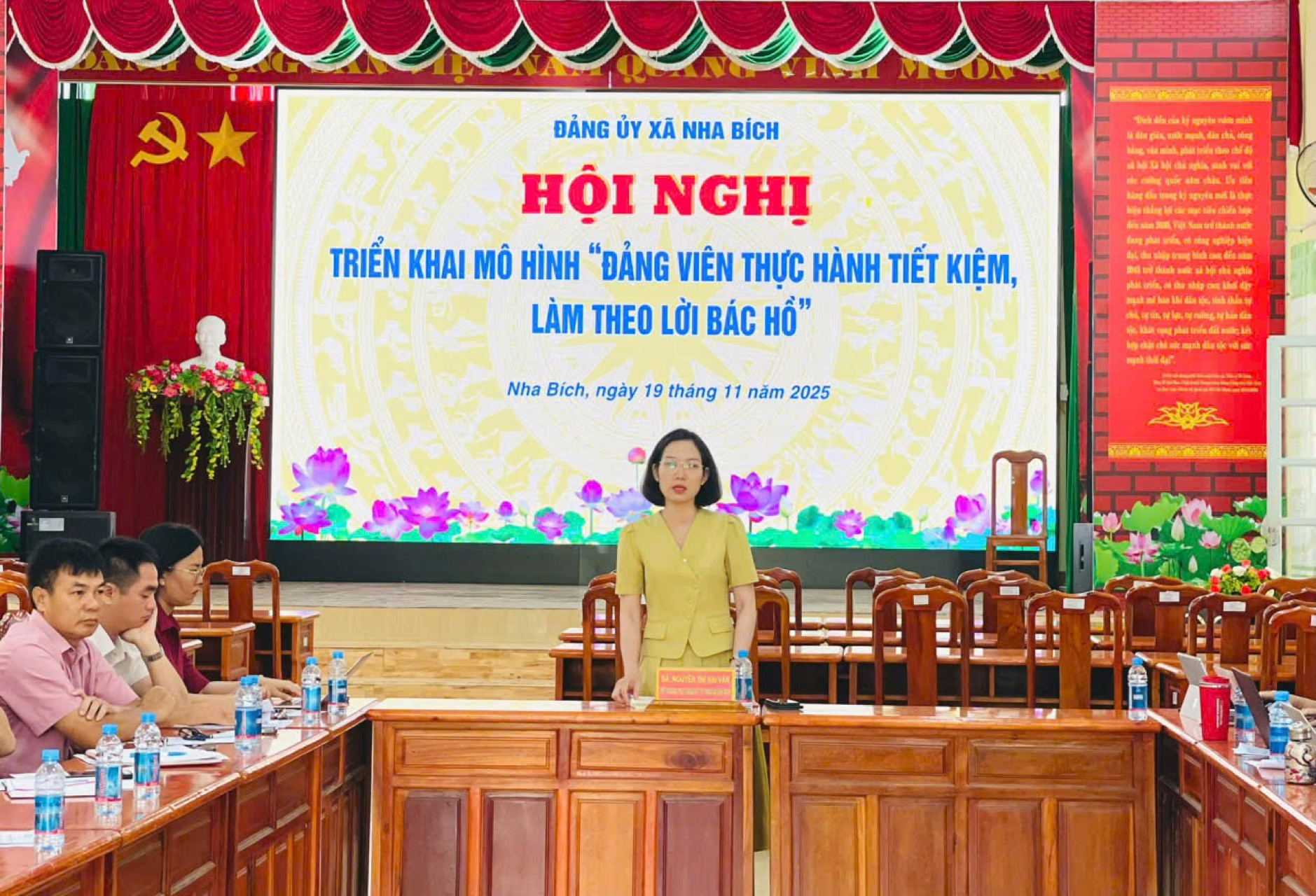 Ngày 19/11/2025 Đảng uỷ xã Nha Bích tổ chức Hội nghị Triển khai mô hình “Đảng viên thực hành tiết kiệm, làm theo lời Bác Hồ”. Đồng chí Nguyễn Thị Hải Vân – PBT Thường trực – Chủ tịch HĐND xã Nha Bích chủ trì Hội nghị, cùng tham dự có các đồng chí trong Tổ giúp việc mô hình.