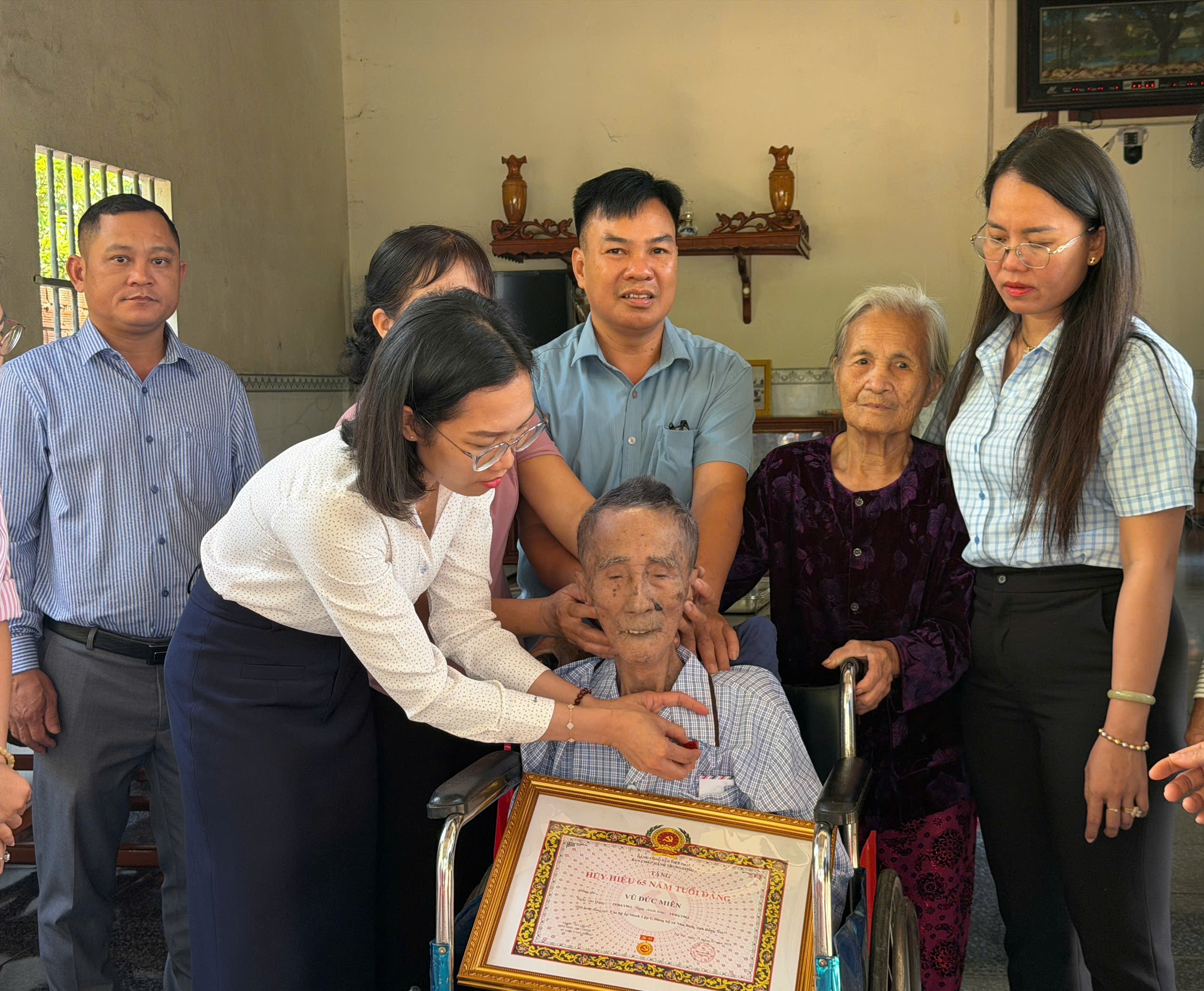 Con gái đồng chí Vũ Đức Miên đã xúc động khi Chi bộ ấp Minh Lập 1 và Đảng uỷ xã Nha Bích đã kịp thời đề xuất để các cấp có thẩm quyền xem xét, chấp thuận kịp thời trao tặng huy hiệu 65 năm tuổi Đảng cho Bố của mình