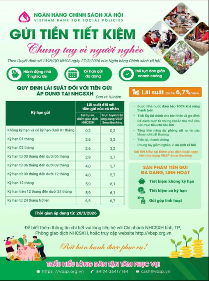 Nguồn tiền gửi tại Ngân hàng Chính sách xã hội luôn được Nhà nước bảo đảm khả năng thanh toán, giúp người dân yên tâm tích lũy cho tương lai. Đồng thời, nguồn vốn huy động được sử dụng đúng mục đích, đúng đối tượng, góp phần hỗ trợ hiệu quả công tác giảm nghèo, giải quyết việc làm và bảo đảm an sinh xã hội tại địa phương.