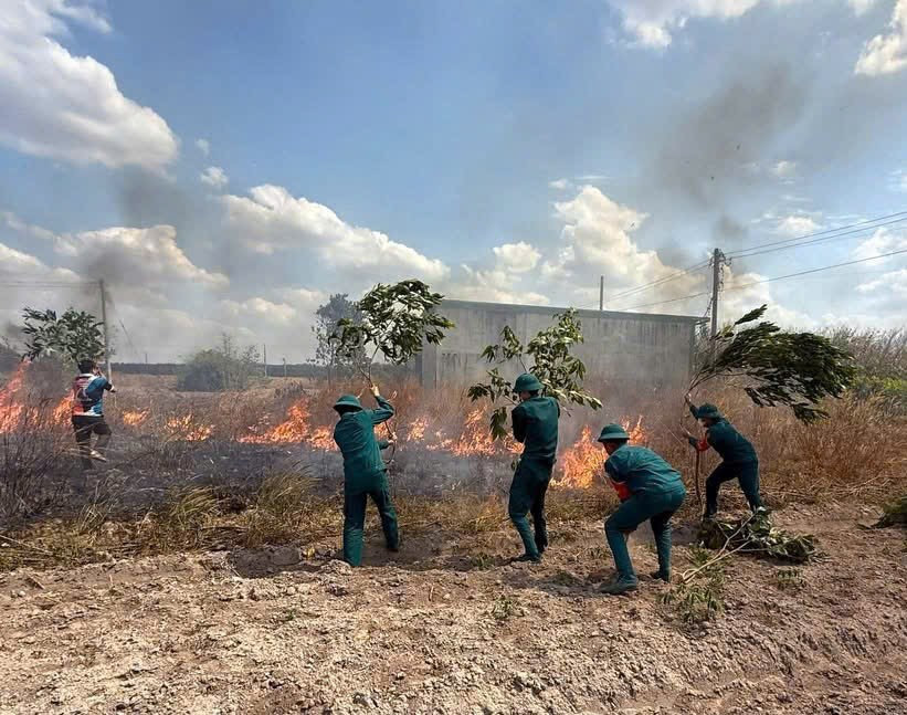 Ban Chỉ huy Quân sự và Công an xã Nha Bích phối hợp kịp thời dập tắt đám cháy ở khu tái định cư ấp Suối Ngang