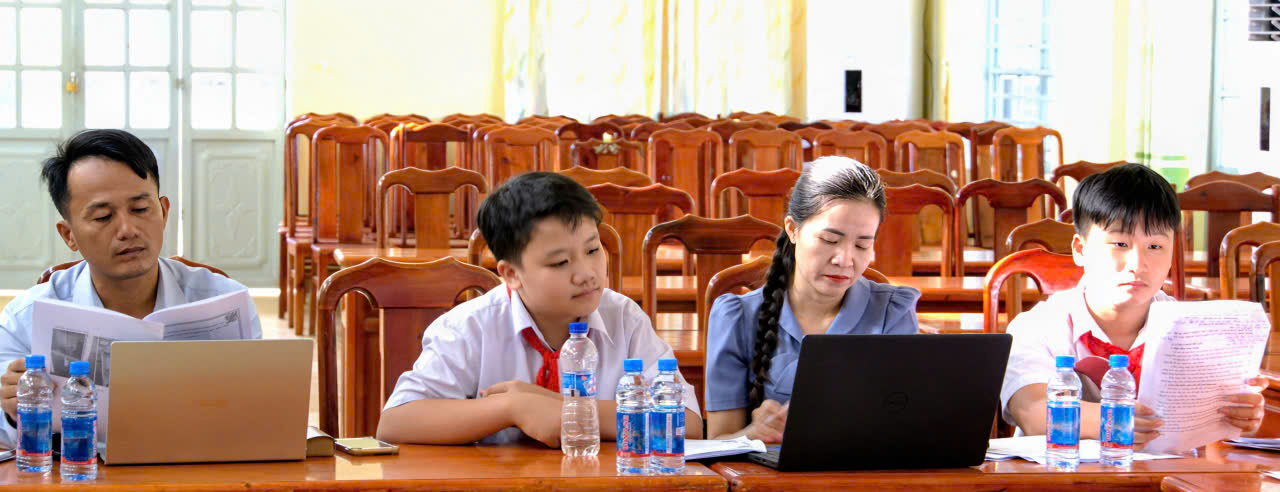 Các em học sinh trường THCS Minh Thắng trình bày dự án của mình. Ảnh Tiến Công