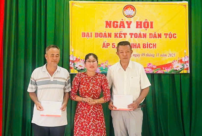* tại Nhà văn hóa ấp 5, Phó Chủ tịch Ủy ban Mặt trận Tổ quốc Việt Nam, Chủ tịch Hội LHPN xã Nha Bích - Thị Cúc dự Ngày hội Đại đoàn kết toàn dân tộc.