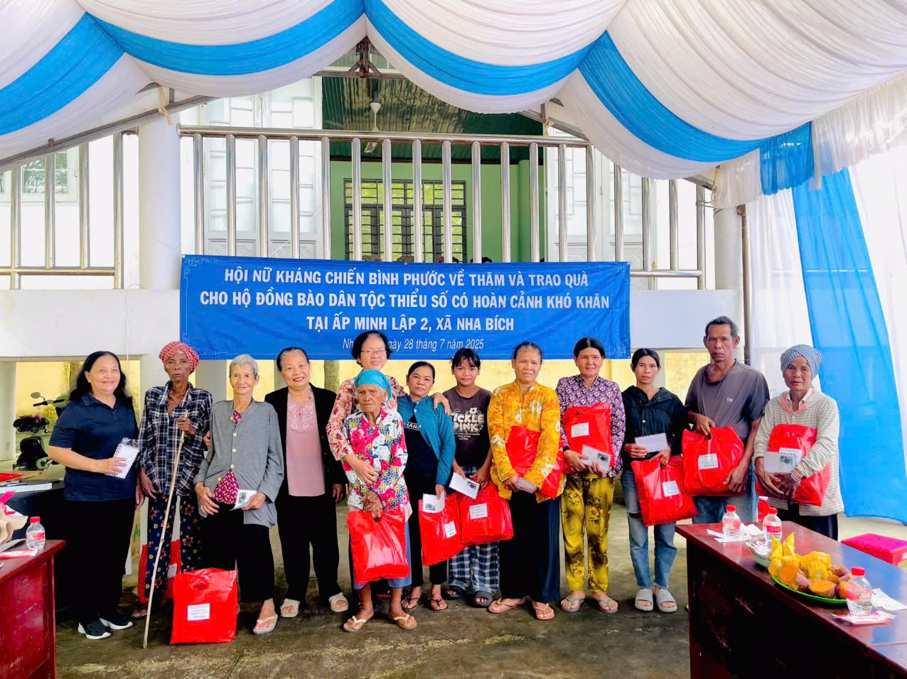 Hội Phụ nữ Kháng chiến Bình Phước về thăm và trao quà cho hội đồng bào Dân tộc thiểu số có hoàn cảnh khó khăn tại ấp Minh Lập 2. Hình ảnh: H.Trang