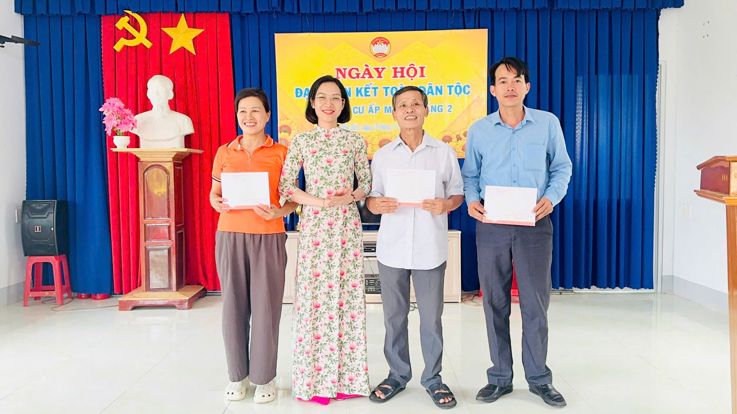 Hình ảnh: Bà Nguyễn Thị Hải Vân PBT.TT Đảng uỷ, Chủ tịch HĐND xã trao tặng quà cho khu dân cư và 2 gia đình tiêu biểu