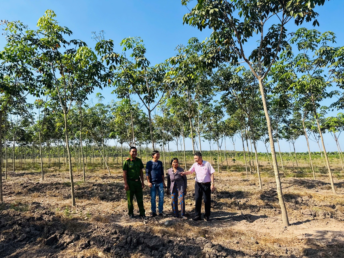 Cán bộ NHCSXH cùng tổ trưởng tổ TK&VV và công an xã Nha Bích kiểm tra thực tế tình hình sử dụng vốn của hộ vay
