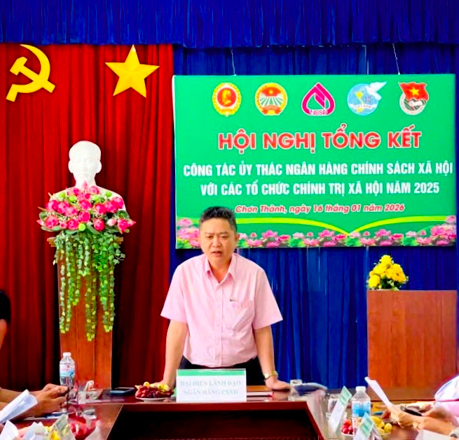 Thực hiện văn bản liên tịch giữa Ngân hàng Chính sách xã hội (NHCSXH) và các tổ chức chính trị – xã hội về việc ủy thác cho vay đối với hộ nghèo, hộ cận nghèo và các đối tượng chính sách khác, chiều ngày 16/01/2026, Phòng giao dịch NHCSXH Chơn Thành tổ chức Hội nghị tổng kết hoạt động ủy thác tín dụng chính sách năm 2025 với các tổ chức chính trị – xã hội nhận ủy thác xã Nha Bích. Tham dự hội nghị có đại diện lãnh đạo UBND, Ủy ban MTTQ Việt Nam xã cùng các hội, đoàn thể nhận ủy thác.