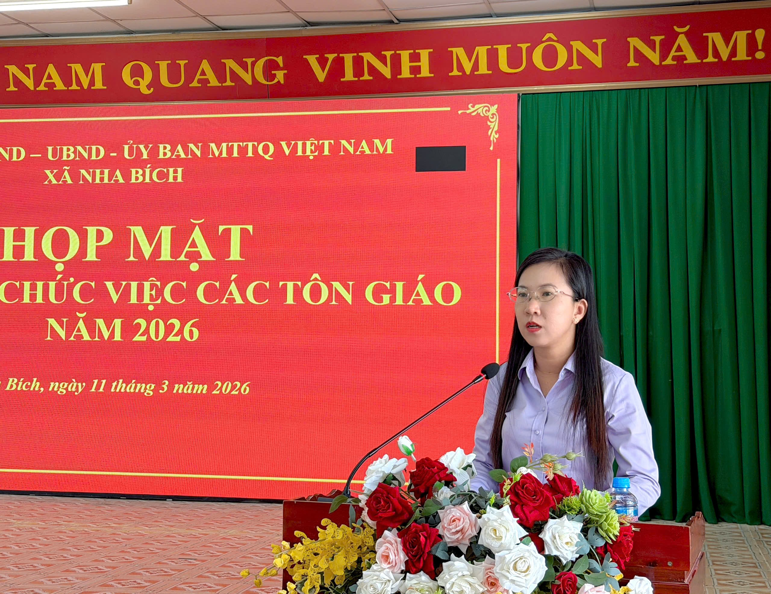 Tại buổi họp mặt, Bà Nguyễn Thị Minh Tiền – Phó Chủ tịch UBND xã đã thông tin tóm tắt tình hình thực hiện nhiệm vụ phát triển kinh tế - xã hội, quốc phòng - an ninh của xã Nha Bích trong năm 2025 và phương hướng, nhiệm vụ trọng tâm năm 2026. Theo đó, trong năm qua, với sự đoàn kết, nỗ lực của cả hệ thống chính trị và sự đồng thuận của Nhân dân, trong đó có sự đóng góp tích cực của các tổ chức tôn giáo và đồng bào theo đạo, xã Nha Bích đã đạt được nhiều kết quả quan trọng trên các lĩnh vực.