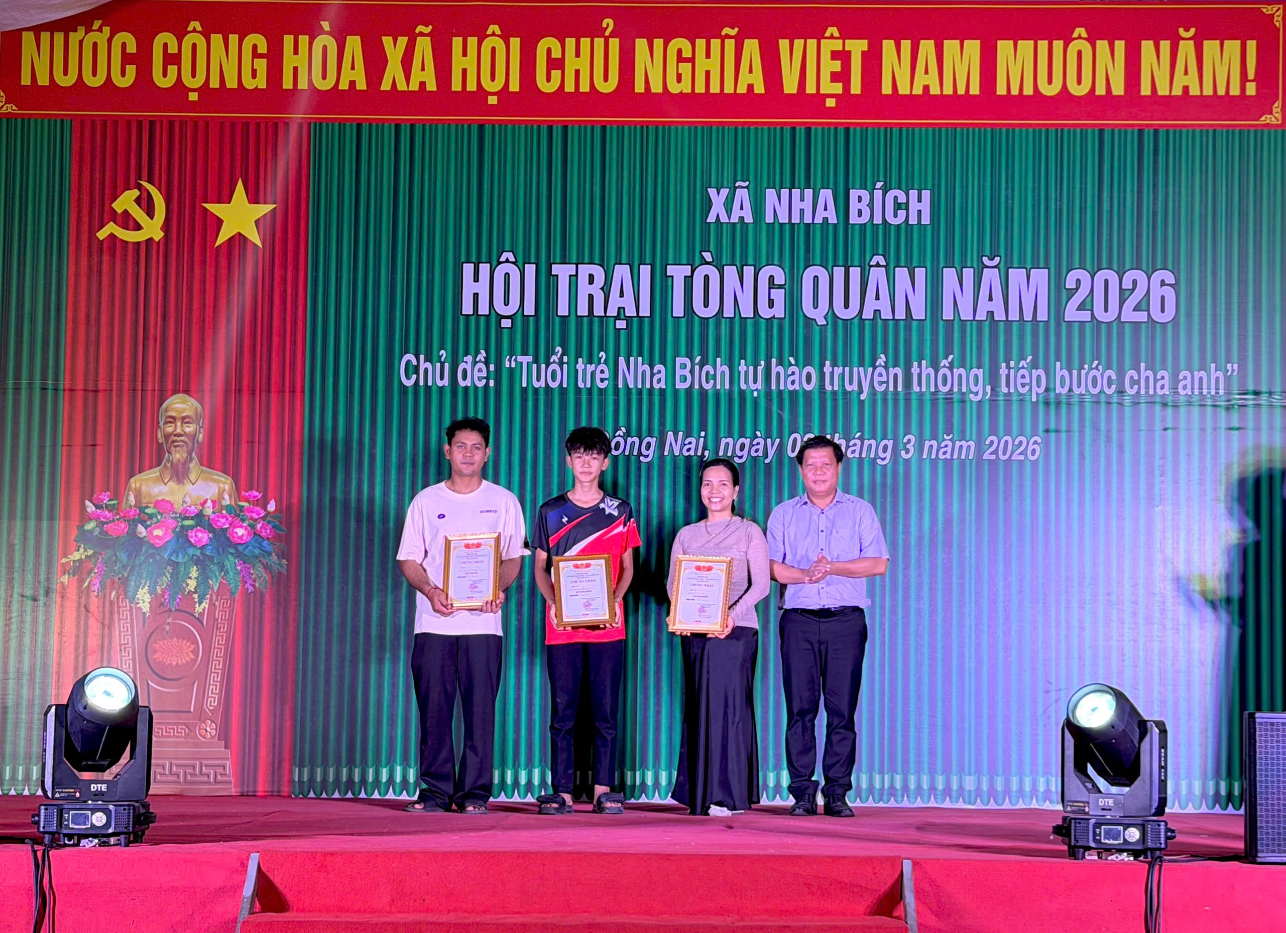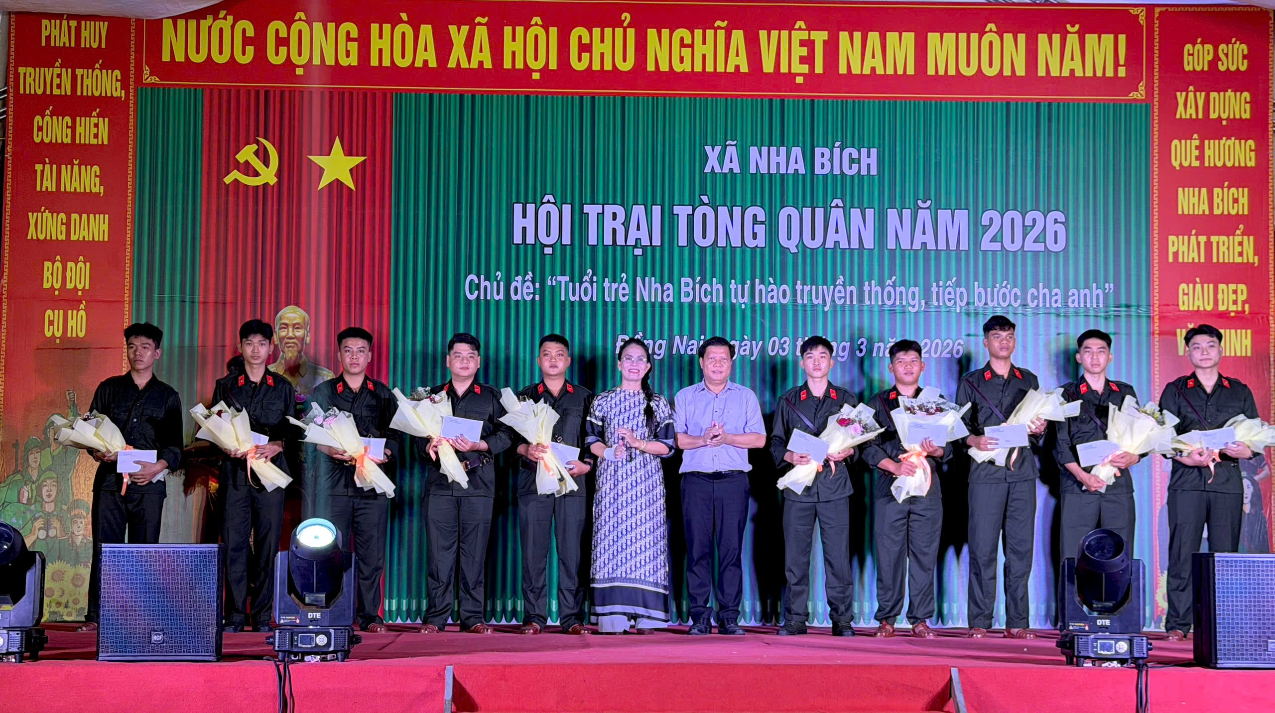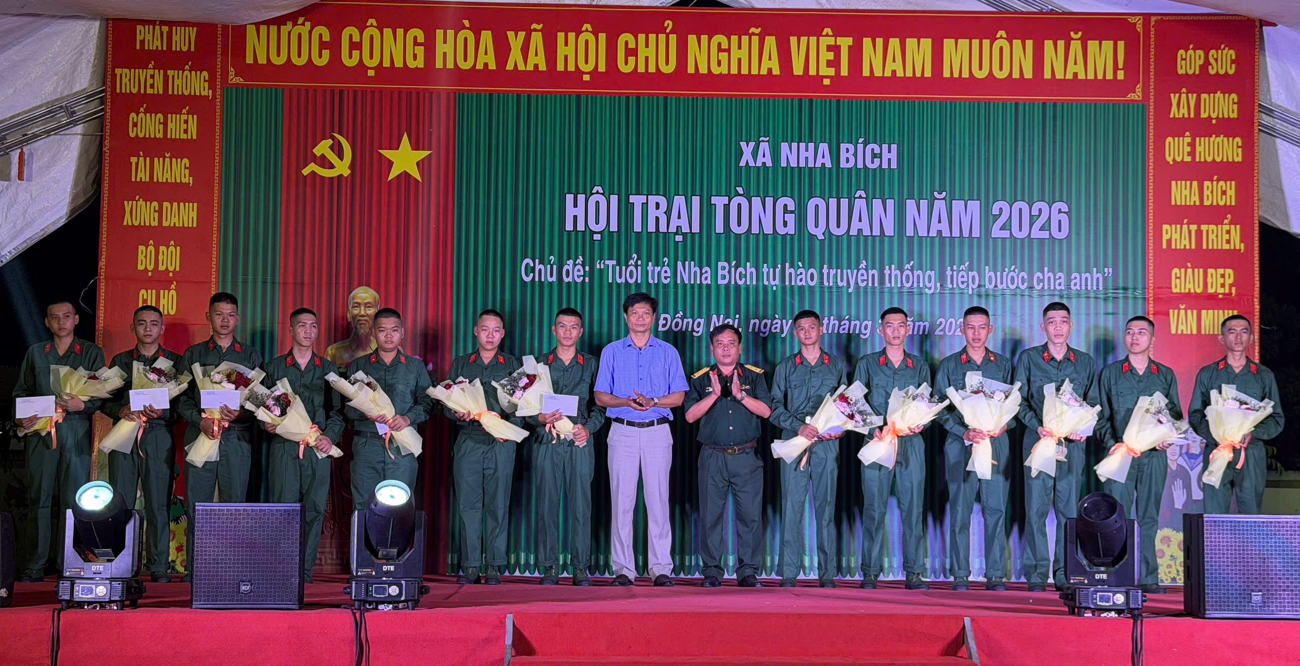 <p style="text-align:justify;">Tối ngày 03/3/2026, UBND xã Nha Bích long trọng tổ chức Đêm hội tòng quân năm 2026 trong khuôn khổ Hội trại tòng quân lần thứ I. Chương trình diễn ra trong không khí ấm áp và đầy khí thế, thể hiện sự quan tâm sâu sắc của cấp ủy, chính quyền và nhân dân địa phương đối với thanh niên chuẩn bị lên đường nhập ngũ.</p><p style="text-align:justify;">Mở đầu chương trình là các tiết mục văn nghệ đặc sắc với chủ đề “Tuổi trẻ Nha Bích tiếp bước cha anh, hành quân giữ nước”, tạo không khí sôi nổi, hào hùng, lan tỏa tinh thần yêu nước và trách nhiệm công dân trong thế hệ trẻ.</p><figure class="image image_resized" style="width:100%;"><img style="aspect-ratio:2686/1973;" src="https://nhabich.dongnai.gov.vn/uploads/nhabich/news/2026_03/image_33.png" width="2686" height="1973" /></figure><p style="text-align:center;"><i>Các tiết mục văn nghệ đặc sắc với chủ đề “Tuổi trẻ Nha Bích tiếp bước cha anh, hành quân giữ nước”</i></p><p style="text-align:justify;">Tham dự đêm hội có Đồng chí Nguyễn Thị Hải Vân – Phó Bí thư TT, Chủ tịch HĐND xã; đồng chí Nguyễn Hồng Thái – PBT, Chủ tịch UBND xã cùng các đồng chí lãnh đạo HĐND – UBND – Ủy ban MTTQ Việt Nam xã; các đồng chí thành viên Hội đồng Nghĩa vụ quân sự xã; đại diện các ban ngành, đoàn thể cùng hơn 150 trại sinh, 45 tân binh và đông đảo bà con nhân dân trên địa bàn xã.</p><p style="text-align:justify;">Tại chương trình, ông Nguyễn Hồng Thái – Phó Bí thư Đảng ủy, Chủ tịch UBND xã, Chủ tịch Hội đồng Nghĩa vụ quân sự xã đã phát biểu động viên, giao nhiệm vụ cho các thanh niên lên đường nhập ngũ. Đồng chí nhấn mạnh, thực hiện nghĩa vụ quân sự vừa là trách nhiệm, vừa là niềm vinh dự lớn lao của mỗi công dân; mong muốn các tân binh phát huy truyền thống quê hương Nha Bích anh hùng, tích cực rèn luyện, chấp hành nghiêm kỷ luật quân đội, hoàn thành xuất sắc mọi nhiệm vụ được giao.</p><figure class="image"><img style="aspect-ratio:2560/1890;" src="https://nhabich.dongnai.gov.vn/uploads/nhabich/news/2026_03/image_34.png" width="2560" height="1890" /></figure><p style="text-align:center;"><i>Ông Nguyễn Hồng Thái – Phó Bí thư Đảng ủy, Chủ tịch UBND xã, Chủ tịch Hội đồng Nghĩa vụ quân sự xã đã phát biểu động viên, giao nhiệm vụ cho các thanh niên lên đường nhập ngũ</i></p><p style="text-align:justify;">Điểm nhấn của đêm hội là phần tuyên dương 45 thanh niên trúng tuyển nghĩa vụ quân sự và nghĩa vụ tham gia Công an nhân dân. Trong không khí trang trọng, các đồng chí lãnh đạo xã đã trao hoa, quà và gửi gắm niềm tin, sự kỳ vọng vào lớp thanh niên ưu tú – những người sẽ tiếp nối truyền thống vẻ vang của quê hương và dân tộc.</p><p style="text-align:justify;">&nbsp;</p><p style="text-align:justify;">&nbsp;</p><p style="text-align:justify;">&nbsp;</p><figure class="image"><img style="aspect-ratio:2560/1406;" src="https://nhabich.dongnai.gov.vn/uploads/nhabich/news/2026_03/image_35.png" width="2560" height="1406" /></figure><figure class="image"><img style="aspect-ratio:2560/1312;" src="https://nhabich.dongnai.gov.vn/uploads/nhabich/news/2026_03/image_36.png" width="2560" height="1312" /></figure><figure class="image"><img style="aspect-ratio:2560/1468;" src="https://nhabich.dongnai.gov.vn/uploads/nhabich/news/2026_03/image_37.png" width="2560" height="1468" /></figure><figure class="image"><img style="aspect-ratio:2560/1432;" src="https://nhabich.dongnai.gov.vn/uploads/nhabich/news/2026_03/image_38.png" width="2560" height="1432" /></figure><p style="text-align:center;"><i>Tuyên dương 45 thanh niên trúng tuyển nghĩa vụ quân sự và nghĩa vụ tham gia Công an nhân dân</i></p><p style="text-align:justify;">Cũng trong chương trình, Ban Tổ chức đã công bố và trao giải cho các tập thể đạt thành tích xuất sắc trong các hoạt động Hội trại tòng quân, tạo không khí thi đua sôi nổi, đoàn kết giữa các đơn vị.</p><figure class="image"><img style="aspect-ratio:2561/1856;" src="https://nhabich.dongnai.gov.vn/uploads/nhabich/news/2026_03/image_39.png" width="2561" height="1856" /></figure><figure class="image"><img style="aspect-ratio:2561/1859;" src="https://nhabich.dongnai.gov.vn/uploads/nhabich/news/2026_03/image_40.png" width="2561" height="1859" /></figure><figure class="image"><img style="aspect-ratio:2560/1768;" src="https://nhabich.dongnai.gov.vn/uploads/nhabich/news/2026_03/image_41.png" width="2560" height="1768" /></figure><figure class="image"><img style="aspect-ratio:2655/1711;" src="https://nhabich.dongnai.gov.vn/uploads/nhabich/news/2026_03/image_42.png" width="2655" height="1711" /></figure><p style="text-align:center;"><i>Ban Tổ chức đã công bố và trao giải cho các tập thể đạt thành tích xuất sắc trong các hoạt động Hội trại tòng quân</i></p><p style="text-align:justify;">Đêm hội khép lại bằng phần sinh hoạt lửa trại trong không khí ấm áp, nghĩa tình, tiếp thêm động lực và niềm tin cho các tân binh trước ngày lên đường làm nhiệm vụ bảo vệ Tổ quốc.</p><figure class="image"><img style="aspect-ratio:1320/735;" src="https://nhabich.dongnai.gov.vn/uploads/nhabich/news/2026_03/image_43.png" width="1320" height="735" /></figure><p style="text-align:center;"><i>Đêm hội khép lại bằng phần sinh hoạt lửa trại</i></p><p style="text-align:just