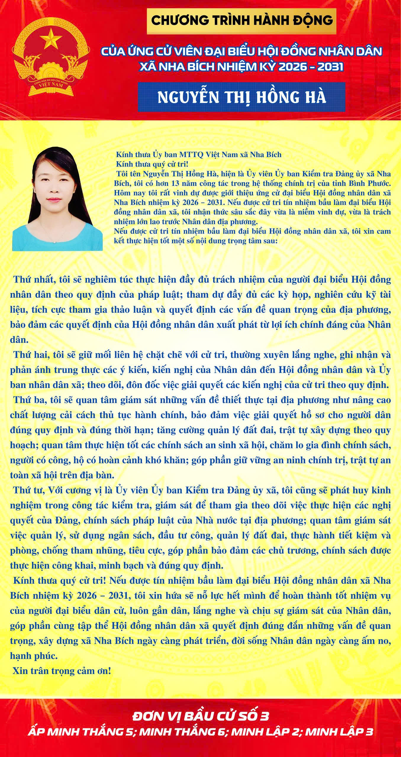 <p>CHƯƠNG TRÌNH HÀNH ĐỘNG CỦA CÁC ỨNG CỬ VIÊN ĐẠI BIỂU HĐND XÃ NHA BÍCH NHIỆM KỲ 2026-2031 TẠI KHU VỰC BẦU CỬ SỐ 3</p><figure class="image"><img style="aspect-ratio:1355/2560;" src="https://nhabich.dongnai.gov.vn/uploads/nhabich/news/2026_03/z7618916476740_855831955abe3184fcf919534d3fc2ae.jpg" width="1355" height="2560" /></figure><figure class="image"><img style="aspect-ratio:1354/2560;" src="https://nhabich.dongnai.gov.vn/uploads/nhabich/news/2026_03/image_128.png" width="1354" height="2560" /></figure><figure class="image"><img style="aspect-ratio:1355/2560;" src="https://nhabich.dongnai.gov.vn/uploads/nhabich/news/2026_03/z7618660557915_f48f5bf57cd13d3696a44bf8ea7f4de8.jpg" width="1355" height="2560" /></figure><figure class="image"><img style="aspect-ratio:1355/2560;" src="https://nhabich.dongnai.gov.vn/uploads/nhabich/news/2026_03/z7618560858159_723d181454dfb9842332c2bac9edee08.jpg" width="1355" height="2560" /></figure><figure class="image"><img style="aspect-ratio:677/1280;" src="https://nhabich.dongnai.gov.vn/uploads/nhabich/news/2026_03/z7617653693840_3e29e69fb226f2914b017c3f21e073b8.jpg" width="677" height="1280" /></figure><figure class="image"><img style="aspect-ratio:1354/2560;" src="https://nhabich.dongnai.gov.vn/uploads/nhabich/news/2026_03/z7616221055875_7e3ae77497ece7f767bae0438994b616.jpg" width="1354" height="2560" /></figure><figure class="image"><img style="aspect-ratio:1355/2560;" src="https://nhabich.dongnai.gov.vn/uploads/nhabich/news/2026_03/z7618561148108_16cd2fc3a0e99550bf96998de37c85e6.jpg" width="1355" height="2560" /></figure><figure class="image"><img style="aspect-ratio:677/1280;" src="https://nhabich.dongnai.gov.vn/uploads/nhabich/news/2026_03/z7617587285357_eefcade4528be8b1932bfb6c56ace3fd.jpg" width="677" height="1280" /></figure><p style="text-align:center;">Thiết kế hình ảnh: Lê Sỹ Hiệp</p><p>&nbsp;</p>