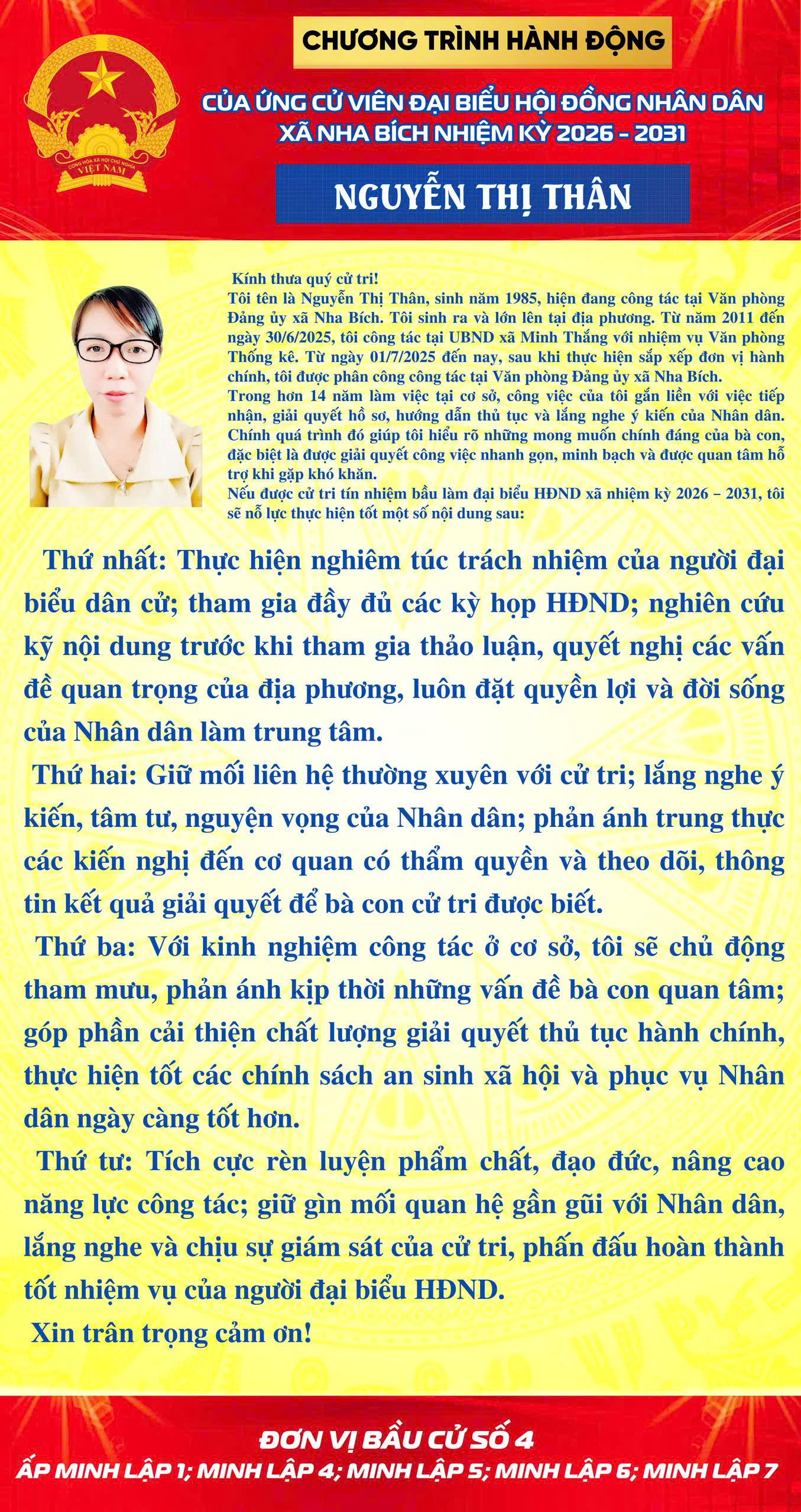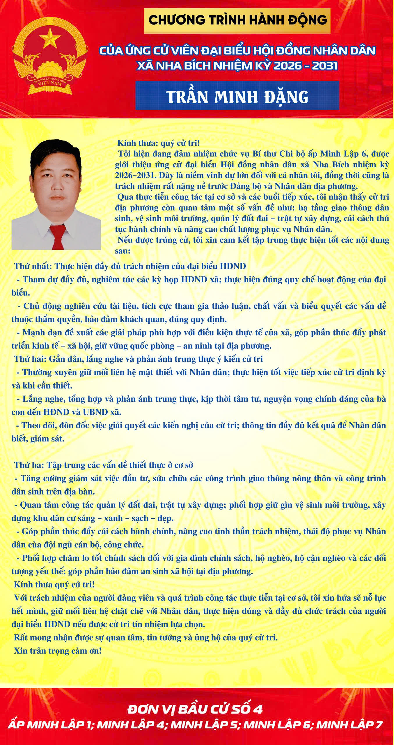 <p>CHƯƠNG TRÌNH HÀNH ĐỘNG CỦA CÁC ỨNG CỬ VIÊN ĐẠU BIỂU HĐND XÃ NHA BÍCH NHIỆM KỲ 2026-2031 TẠI ĐƠN VỊ BẦU CỬ SỐ 4</p><figure class="image"><img style="aspect-ratio:1354/2560;" src="https://nhabich.dongnai.gov.vn/uploads/nhabich/news/2026_03/z7616220726676_d1fd336e333be49f5408ca8dc0969b09.jpg" width="1354" height="2560" /></figure><figure class="image"><img style="aspect-ratio:888/1280;" src="https://nhabich.dongnai.gov.vn/uploads/nhabich/news/2026_03/z7621087876108_b0f673680387156ffaea7661ef6d73ae.jpg" width="888" height="1280" /></figure><figure class="image"><img style="aspect-ratio:1354/2560;" src="https://nhabich.dongnai.gov.vn/uploads/nhabich/news/2026_03/z7616220845738_0c99398e1cb601b91b9245bc05a4fb91.jpg" width="1354" height="2560" /></figure><figure class="image"><img style="aspect-ratio:1354/2560;" src="https://nhabich.dongnai.gov.vn/uploads/nhabich/news/2026_03/z7616220623180_85f66a0754f5aca357241bd5eaf0f837.jpg" width="1354" height="2560" /></figure><figure class="image"><img style="aspect-ratio:1354/2560;" src="https://nhabich.dongnai.gov.vn/uploads/nhabich/news/2026_03/z7616221179308_82255c85f929ba7cffe5c469ff3e2a40.jpg" width="1354" height="2560" /></figure><figure class="image"><img style="aspect-ratio:1355/2560;" src="https://nhabich.dongnai.gov.vn/uploads/nhabich/news/2026_03/z7619060324395_c59cffcd8f4db47d13fee2350a6020c7.jpg" width="1355" height="2560" /></figure><figure class="image"><img style="aspect-ratio:1355/2560;" src="https://nhabich.dongnai.gov.vn/uploads/nhabich/news/2026_03/z7618561273275_e07a0f99a826316ab37baccce1ca73aa.jpg" width="1355" height="2560" /></figure><figure class="image"><img style="aspect-ratio:1355/2560;" src="https://nhabich.dongnai.gov.vn/uploads/nhabich/news/2026_03/z7618561005792_856a4a8bbeda234cd1373f5951c1b947.jpg" width="1355" height="2560" /></figure>