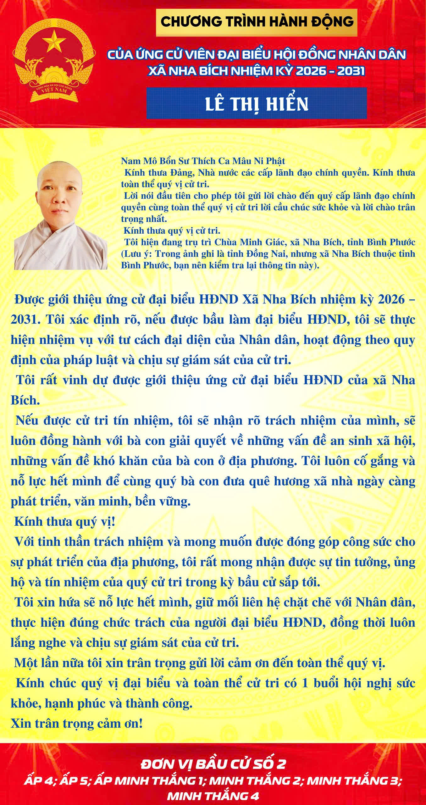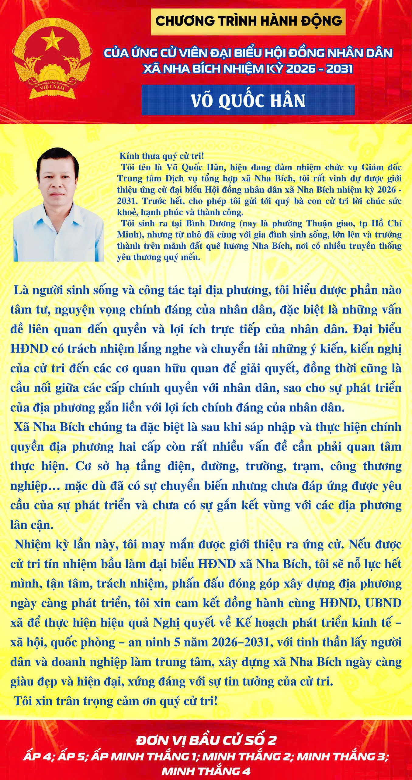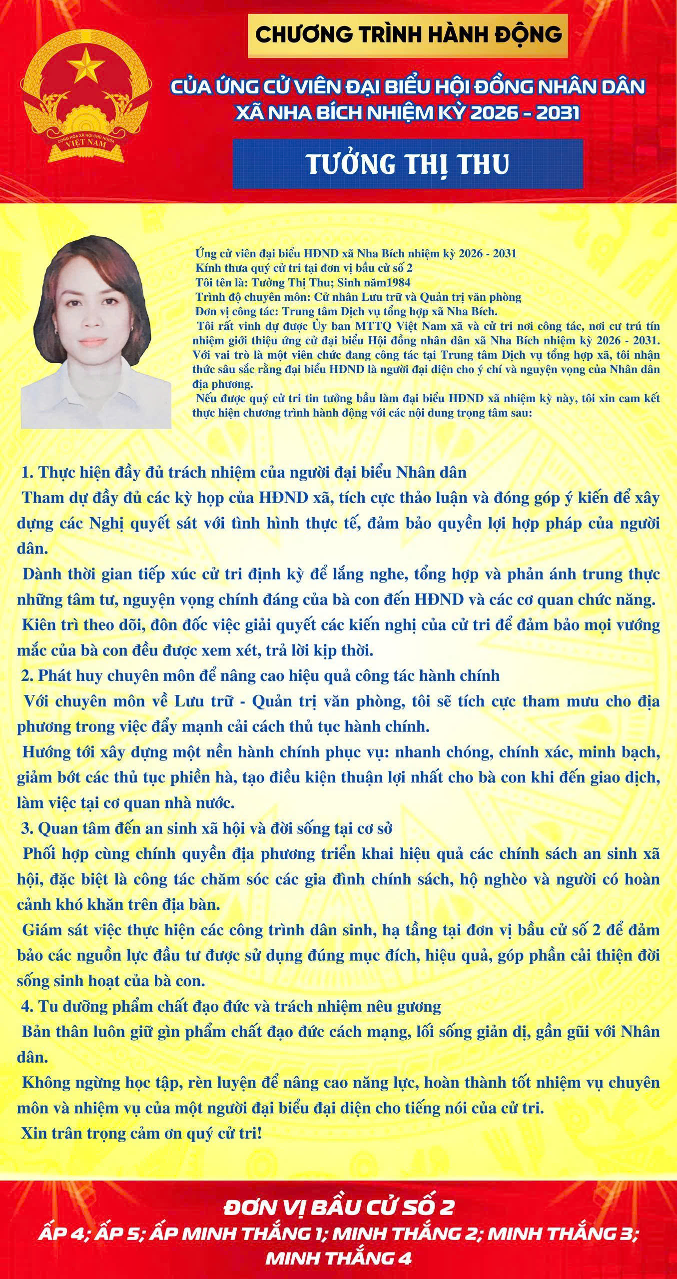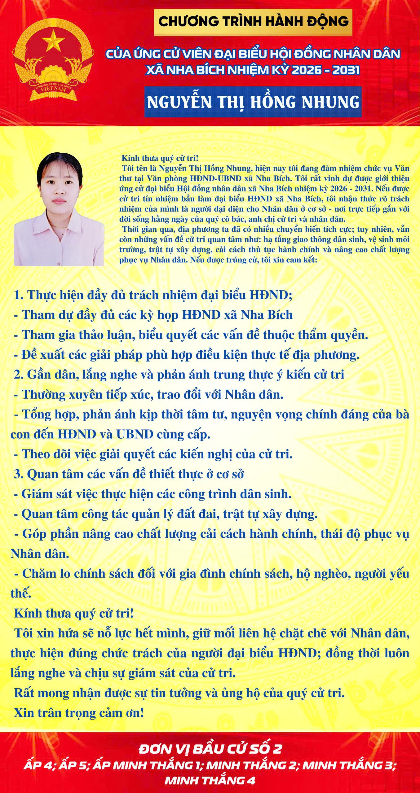 <p>CHƯƠNG TRÌNH HÀNH ĐỘNG CỦA CÁC ỨNG CỬ VIÊN ĐẠI BIỂU HĐND XÃ NHA BÍCH NHIỆM KỲ 2026-2031 TẠI KHU VỰC BẦU CỬ SỐ 2</p><figure class="image"><img style="aspect-ratio:1355/2560;" src="https://nhabich.dongnai.gov.vn/uploads/nhabich/news/2026_03/z7618561065602_9edd23b720b35f6befefae55718e2ccd.jpg" width="1355" height="2560" /></figure><figure class="image"><img style="aspect-ratio:1355/2560;" src="https://nhabich.dongnai.gov.vn/uploads/nhabich/news/2026_03/z7618561213354_2bc18b14cf7a7111c3e45dc2de8d4950.jpg" width="1355" height="2560" /></figure><figure class="image"><img style="aspect-ratio:1355/2560;" src="https://nhabich.dongnai.gov.vn/uploads/nhabich/news/2026_03/z7618660463622_7fa11a0888fe7f3bd3277d6fc0dbe512.jpg" width="1355" height="2560" /></figure><figure class="image"><img style="aspect-ratio:1355/2560;" src="https://nhabich.dongnai.gov.vn/uploads/nhabich/news/2026_03/z7618560917378_14dbe80bc64effdeb6e54105fcdee780.jpg" width="1355" height="2560" /></figure><figure class="image"><img style="aspect-ratio:1354/2560;" src="https://nhabich.dongnai.gov.vn/uploads/nhabich/news/2026_03/z7616221282351_de3ad9d1771b4afc2dd329923845b27b.jpg" width="1354" height="2560" /></figure><figure class="image"><img style="aspect-ratio:1355/2560;" src="https://nhabich.dongnai.gov.vn/uploads/nhabich/news/2026_03/z7618660104506_88e1bb0d16fc5f015e5159f6df8cf278.jpg" width="1355" height="2560" /></figure><figure class="image"><img style="aspect-ratio:1355/2560;" src="https://nhabich.dongnai.gov.vn/uploads/nhabich/news/2026_03/z7618713993605_2bce2aa48f46eb78c08108add3132653.jpg" width="1355" height="2560" /></figure><figure class="image"><img style="aspect-ratio:1355/2560;" src="https://nhabich.dongnai.gov.vn/uploads/nhabich/news/2026_03/z7618561595390_14fc47624001de32c9b8c40ea8f9316f.jpg" width="1355" height="2560" /></figure><p style="text-align:center;">Thiết kế hình ảnh: Lê Sỹ Hiệp</p>
