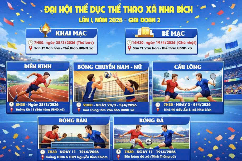 <p>Sáng ngày 20/3/2026 vào lúc 7h00&#039;, sẽ diễn ra Lễ khai mạc Đại hội Thể dục thể thao xã Nha Bích lần thứ I, năm 2026 tại sân Trung tâm văn hoá xã (phía sau trụ sở UBND xã).</p><p>Đại hội Thể dục thể thao xã Nha Bích lần thứ I, năm 2026 (giai đoạn 2) sẽ tổ chức với 05 môn thi đấu gồm: cầu lông, bóng bàn, điền kinh, bóng chuyền nam - nữ và bóng đá nam. Thời gian diễn ra các môn thi đấu từ ngày 28/3/2026 đến ngày 19/4/2026.</p><p>Trân trọng kính mời nhân dân đến tham dự Lễ khai mạc và đến xem, cổ vũ cho các môn thi đấu tại Đại hội.</p><figure class="image"><img style="aspect-ratio:918/613;" src="https://nhabich.dongnai.gov.vn/uploads/nhabich/news/2026_03/dai-hoi-tdtt-xa-nam-2026_1.jpg" width="918" height="613" /></figure><p style="text-align:center;">Thiết kế hình ảnh: Lê Sỹ Hiệp - Văn phòng HĐND - UBND xã</p>