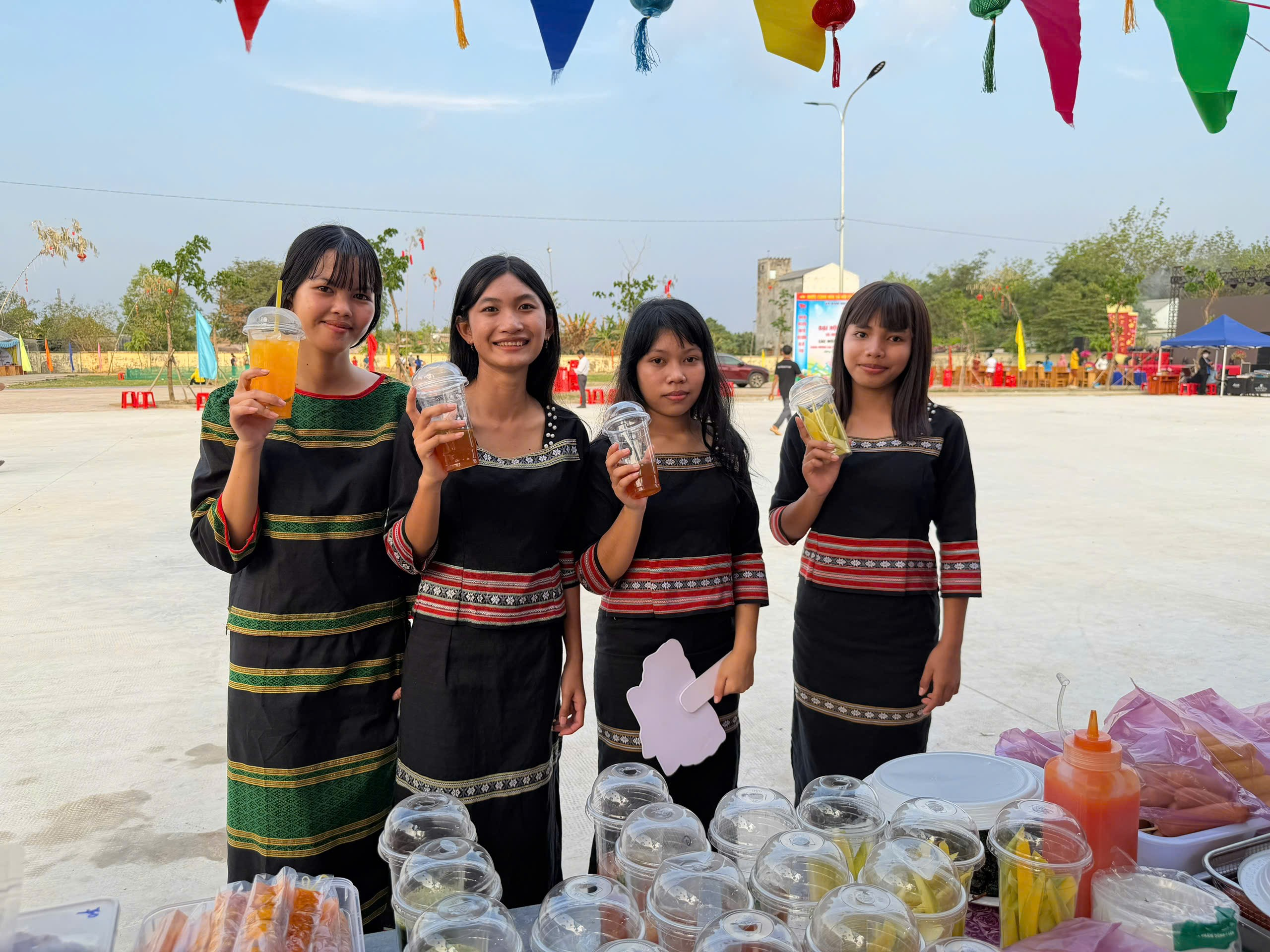 Các thiếu nữ đồng bào dân tộc thiểu số trong trang phục truyền thống vui tươi giới thiệu gian hàng nước giải khát tại hội xuân xã Nha Bích, góp phần tạo nên không khí rộn ràng, đậm đà bản sắc văn hóa trong những ngày giáp Tết.