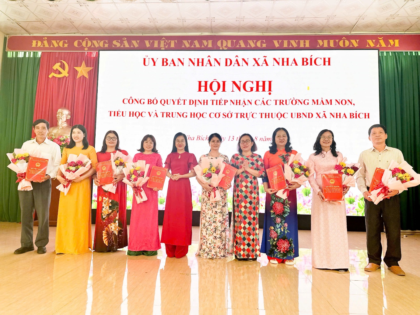 UBND xã Nha Bích trao quyết định tiếp nhận các trường công lập trên địa bàn xã.