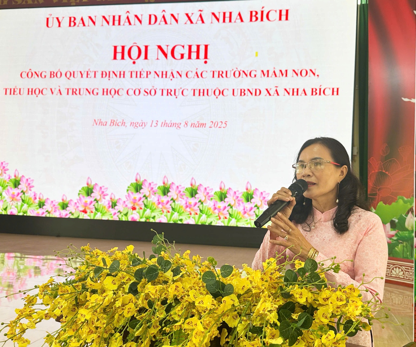 Sáng ngày 13-8-2025, UBND xã Nha Bích tổ chức Hội nghị công bố quyết định tiếp nhận các trường Mầm non, Tiểu học và Trung học cơ sở từ thị xã Chơn Thành về trực thuộc UBND xã Nha Bích. Phó Chủ tịch UBND xã Nguyễn Thị Minh Tiền chủ trì hội nghị.