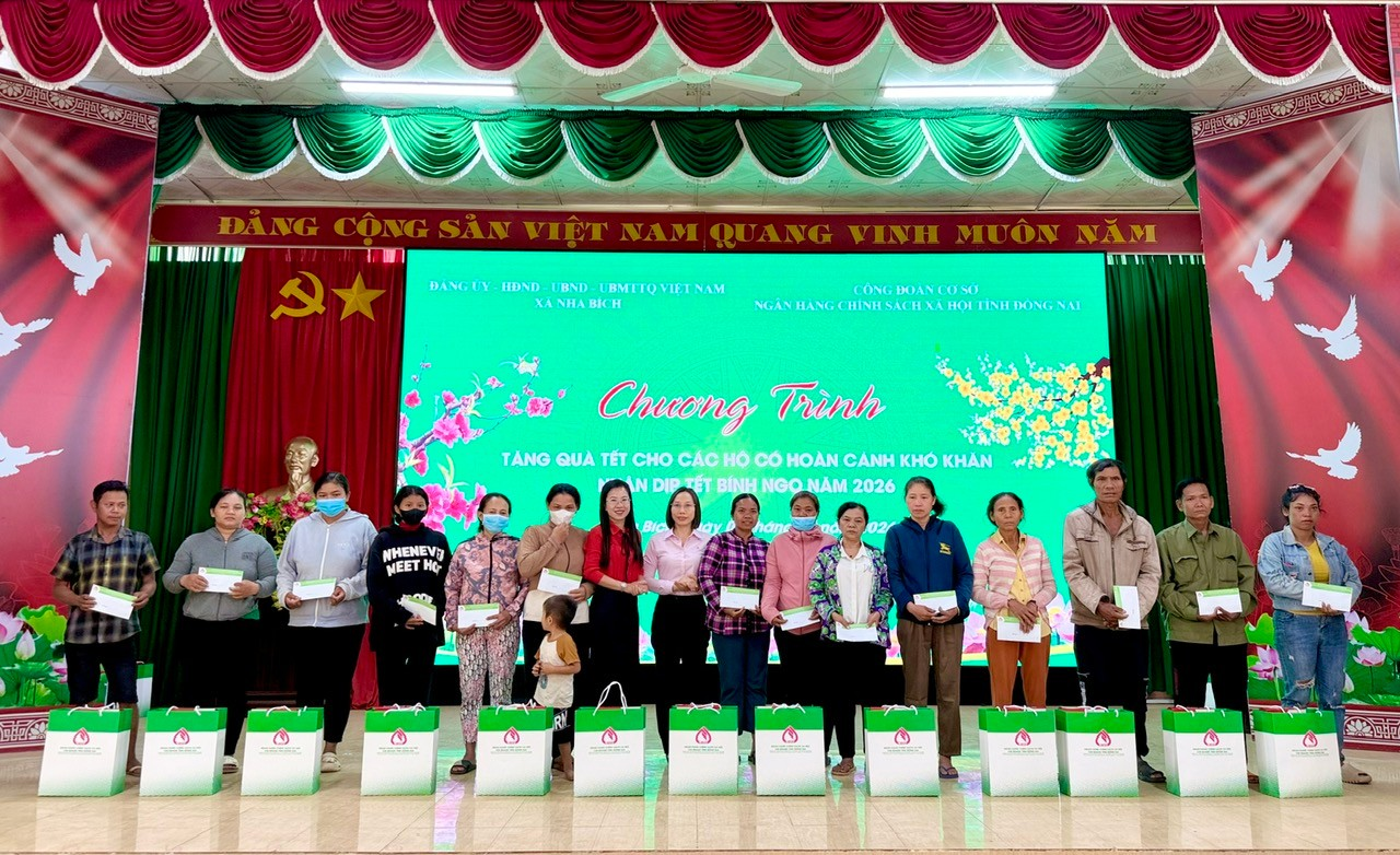 Trong không khí ấm áp, nghĩa tình của những ngày giáp Tết Nguyên đán Bính Ngọ năm 2026, Ngân hàng Nông nghiệp và Phát triển nông thôn (Agribank) Chi nhánh Chơn Thành phối hợp cùng Công đoàn Ngân hàng Chính sách Xã hội tỉnh Đồng Nai đã tổ chức chương trình thăm hỏi, trao tặng quà Tết cho các hộ cận nghèo, hộ có hoàn cảnh khó khăn trên địa bàn xã Nha Bích.
